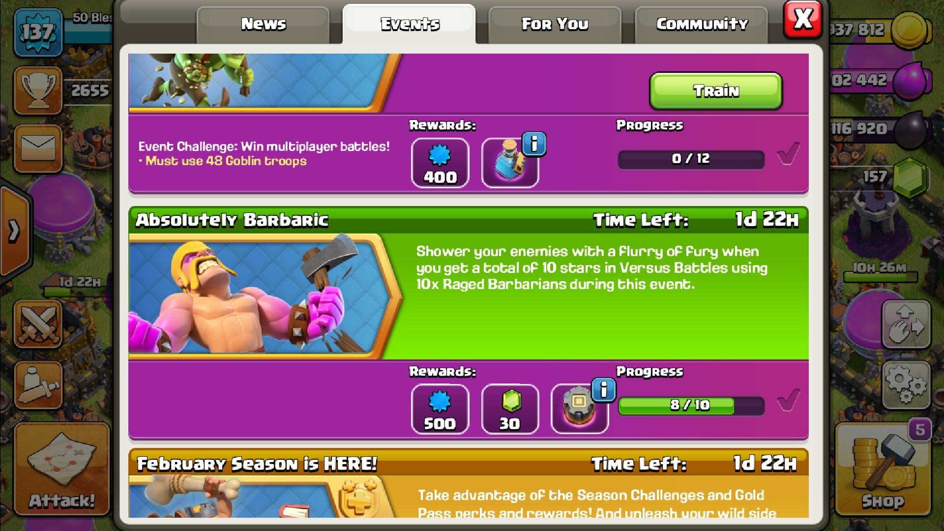 Была введена вторая база, с прокачкой которой появляется возможность получить 6 строителя. Убрали глобальный чат. Теперь траллировать домохозяек и хачню не получится. Ставь эмодзи, определяющий твой стиль игры, и соси хуй получай приглашения от желторожих и прочей нечисти. С декабрьским патчем пообещали исправить и ввести более точный поиск по твоему региону. Введены ЛВК и ИК. ЛВК (Clan War Leagues/CWL) - турнир среди кланов со своей лигой. Проводится раз в месяц, на 15/30 человек, воюется на протяжении 7 дней. По итогам занимаются места, кого-то опускают в лиге, кого-то поднимают. Дают еще медальки, за которые можно купить плюшки для прокачки героев/базы и прочее полезное и не очень. ИК - по окончанию лвк через несколько дней стартует этот ивент, в течении которого всем кланом выполняете задания и зарабатываете очки. Если набрали всем кланом достаточное кол-во очков, то получаете возможность выбрать награду. Сезонные челленджи. В течении месяца делаешь задания и получаешь всякие плюшки для прокачки базы/героев. Если занесешь денежку в размере 300 с небольшим деревянных, то получаешь золотой пропуск и награда за очки увеличивается. Можно перед покупкой глянуть что дают и решить, нужно ли тебе или нет. Еще и скин дают, чтобы перед одноклассниками повыебываться на 4 пике скин варвара текущего сезона. Мини ивенты Как правило между всеми этими событиями есть достаточно времени, чтобы впихнуть еще пару-тройку заданий. Например, за два-четыре дня выиграть n-числом каких-то определенных юнитов битв. Обычно дают скидку на этих юнитов и по итогу какую-то вкусняшку.