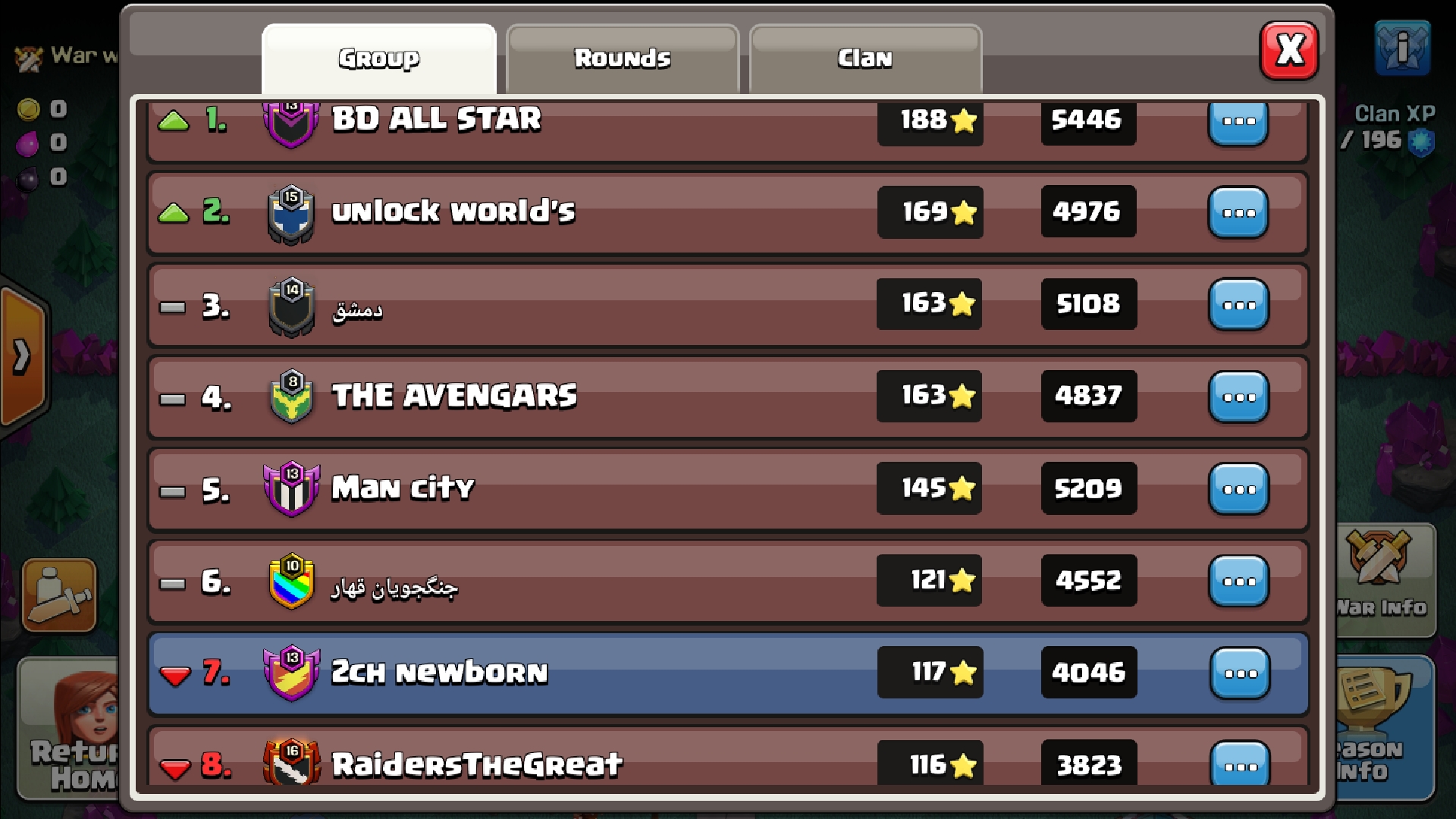 -И сразу к серьезным делам. Пока США и Иран решили поиграть в войнушку, у нас началась настоящая мясорубка ввиде ЛВК. И это полный пиздец товарищи. Чекаем фотокарточку с текущей таблицей и наблюдаем минимальный разрыв в 1-2 звезды между нами и вашим очком остальными кланами. Пиздилка в идеале за топ 2 чтобы апнуть лигу и получить медалек и ордена на грудь, чтобы место в автобусе уступали. Но скорее всего будет 3-4 место, что кстати уже неплохо УЧИТЫВАЯ ЧТО У НЕСКОЛЬКИХ ЧЕЛОВЕК КВИНА НА АПЕ БЛЯТЬ. КВИНА. НА АПЕ. Да вы кто такие чтобы это делать блядь. Вы че ебланы а В первой войне попались слабенькие противники, дальше только сложнее. Если не будем творить хуйню, можем получить и хорошее вознаграждение.