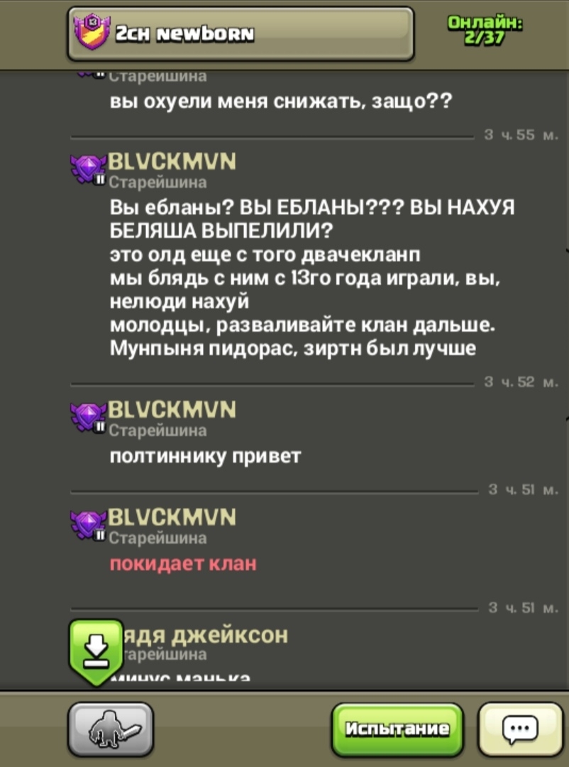 Блядь, как же беляшик был прав, и какие же пиздоболы в треде выше... Монополия медалек закончилась, у нас нормальный клан, кококо - в итоге эти злоебучие киберспортсмены на лвк берут фулл 13ых, которые вкачали абсолютно все, а на остальных кладут хуй. Донат в чате весит часами, попросишь что-нить дать - хуй, гобленов насыпят. Захотел в лвк - соси хуй, ты днище, там только 12+ господа которых все равно на 3 звезды ебошут пиздоглазые, как бы вы не оправдывались, которые выёживаются тем, дескать, если брать не фулл задротов, то клан быстро скатится. Куда ещё вам, собаки, скатываться, когда вы на дне? Ни ногой больше в эту помойку, 2ч моби был гораздо более человечным местом.