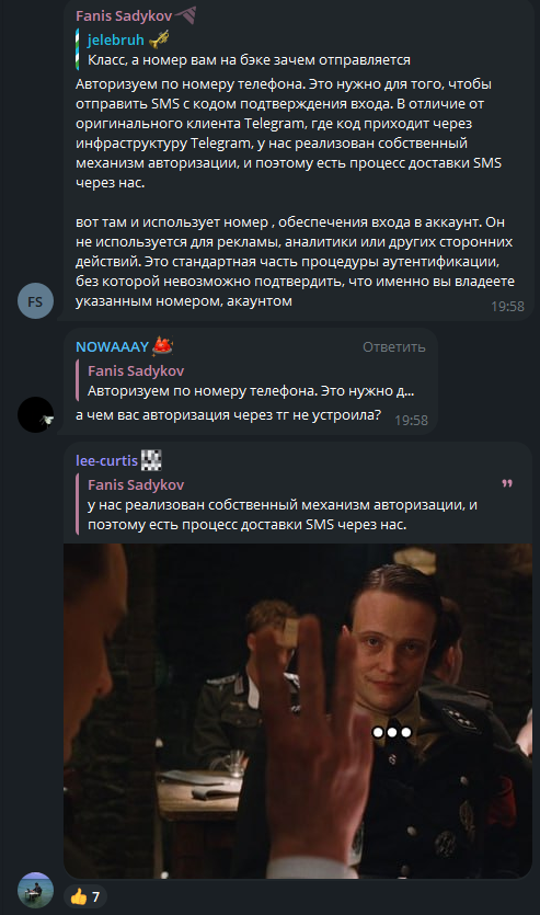 >буквально на виду используется внутренний сервер ВК (dal.mvk), и так же прокси который крутится на VDS/виртульном сервере ВК Ну, да, ну да. Не планирует, и не занимается "какими-то схемами", ты сам-то в свои слова веришь? Он сам лично пришел с обосранными штанами в чат, где это было опубликовано, и начал оправдываться, и своими же словами начал себя ещё сильнее закапывать. Он больше 10 минут не мог ответить зачем они используют чужие номера на бэкенде, и так же, зачем и как отправляют СМС, если в API телеге такого функционала - нет. Это же смешно. >этот клиент телеги тоже не был замечен за плохими действиями Вiрю, я поверiв. Мамой клянёшься? Ты мне сначала ответь, откуда у такой маленькой команды, деньги на рекламу когда в свою очередь, реклама в самой телеге стоит баснословных денег, откуда у них деньги на SDK VK, которая стоит тоже немало, и также почему их виртуальный сервер с проксями до сих пор не закрыл VK, если они предоставляют по сути своей услуги VPN? Не ответишь на эти вопросы? Или будешь также мычать как Фанис? >Ты этого не знаешь, во-первых. Я эти клиенты видел, мне этого достаточно. А вот что касается тебя, то да, ты этого не знаешь, и я могу просто процитировать твои слова: >Твоя аргументация крайне хлипкая. Надо смотреть на факты, а у тебя фактов нет, тупо фантазии.