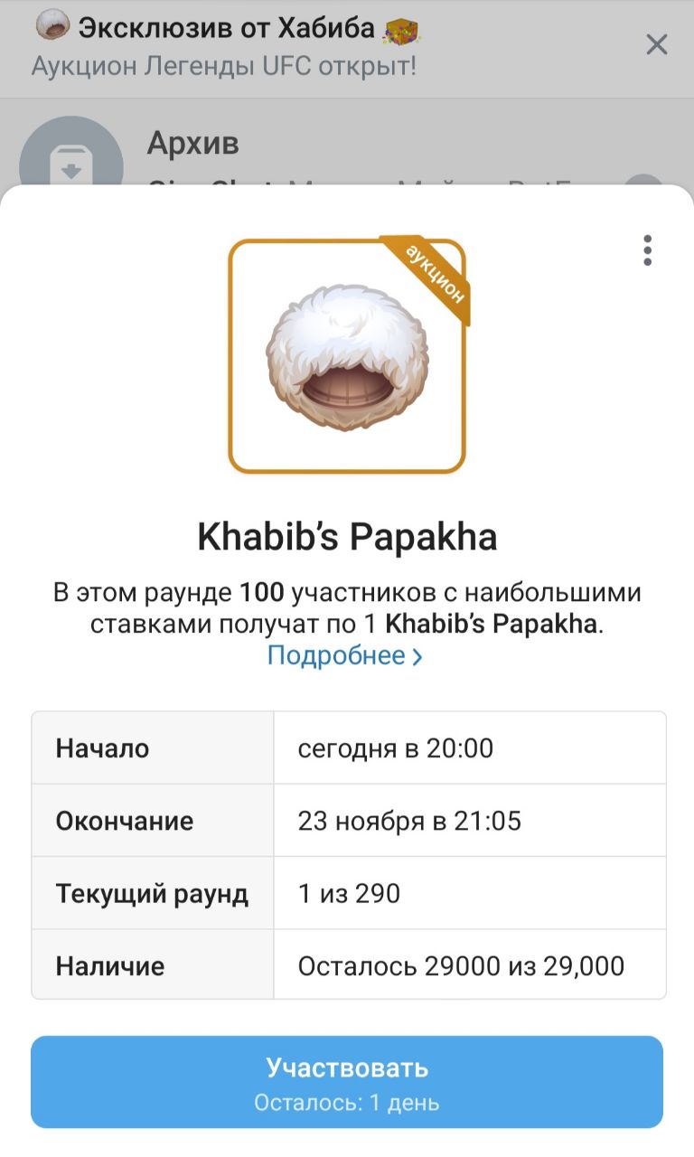 Зашёл в свой любимый мессенджер. И у меня над всеми личными диалогами появилось полезное уведомление о том, что за деньги проводится аукцион картинок с папахой Хабиба. Можно вложить денег, и те, кто больше всех заплатил, получат картинки с папахой Хабиба. Удобно. Спасибо, что напомнили.