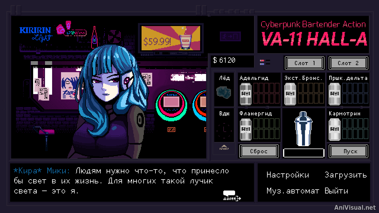4) VA-11 Hall-A (читается как "Вальгалла") – визуальная новелла в киберпанк сеттинге. Вы в роли барменши готовите и наливаете своим гостям различные напитки. От того, что вы намешали своему посетителю зависит дальнейшая судьба вашего с ним диалога, ведь у каждого персонажа свои вкусы и предпочтения. Интерактива оказалось куда меньше, чем предполагалось. Сюжет мне показался несколько затянутым и под конец уже было совсем не так интересно, как в начале. Музыка и визуал создают красивую и глубоко погружающую атмосферу. Присутствуют 2 концовки: хорошая и плохая. На андроид существует неофициальный порт на русском языке.