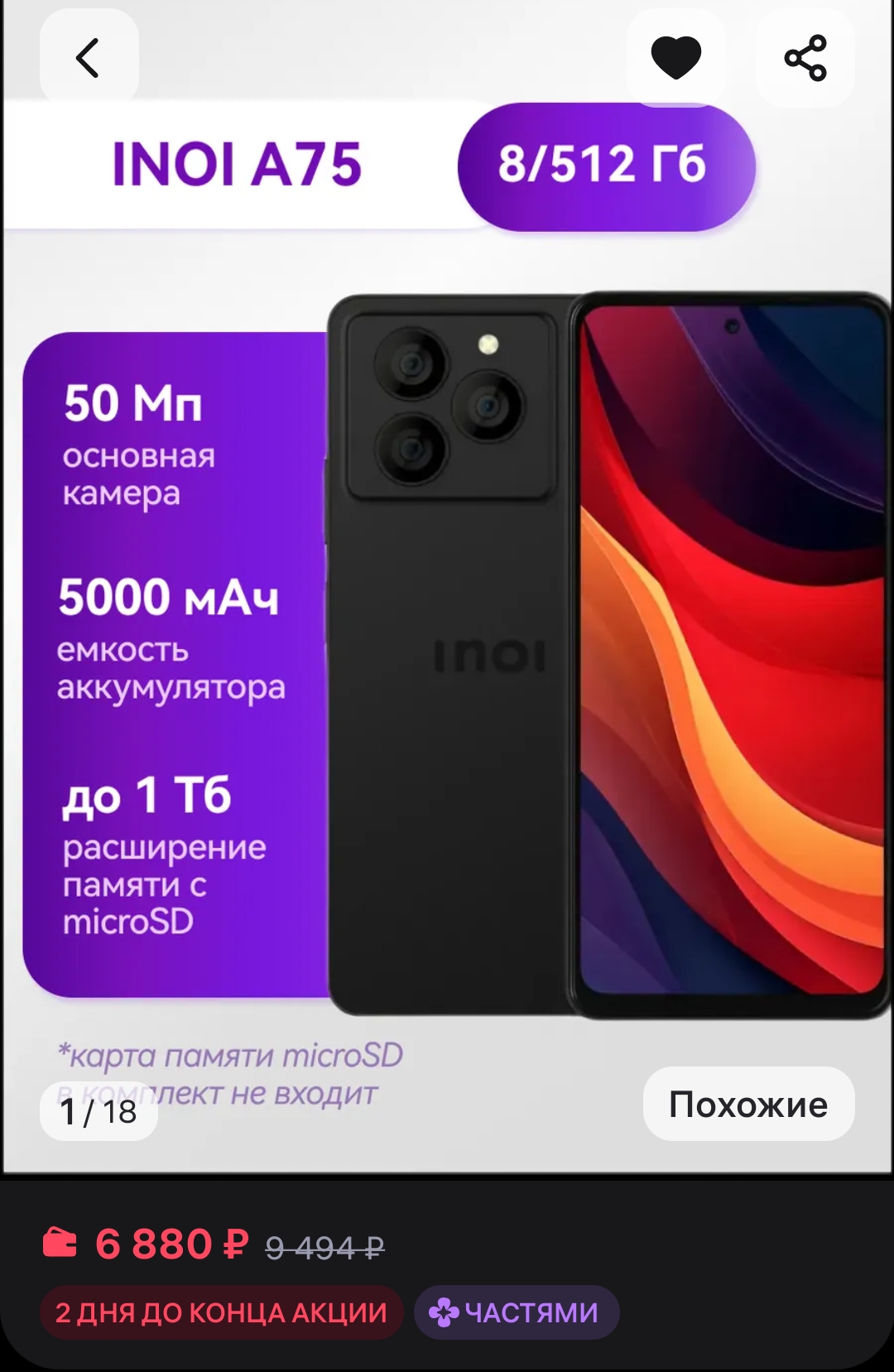 У самого Inoi A75 8 / 512, пользуюсь около полугода, все топ, практически чистый Андроид, нормальные характеристики. В комплекте все есть, покупал на ВБ примерно за 10к. До этого был Иной А83 - тоже хороший смартфон.