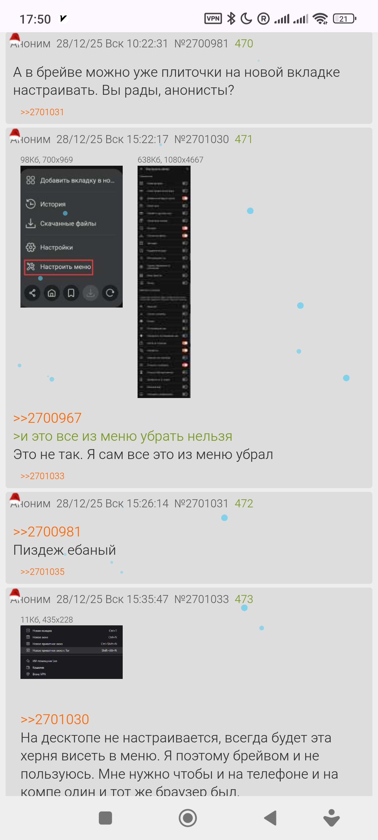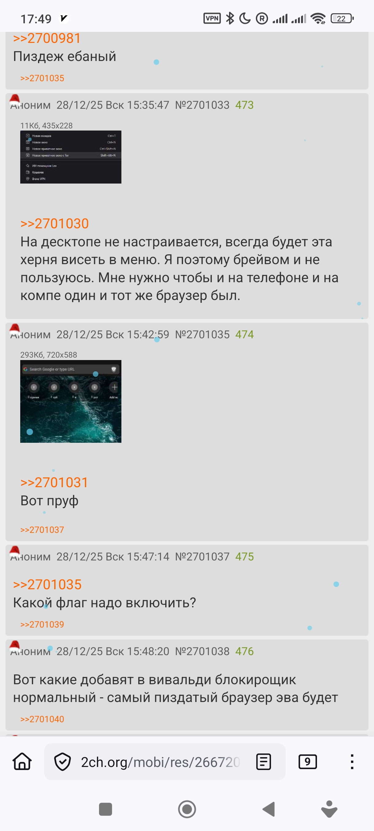 >>2685590 > А чем сейчас пользуешься, пока ждёшь? Firefox. Мне в нем очень нравится что можно открывать ссылку в приложении долгим тапом, а не просто установить по умолчанию открытие в приложении и главный экран с недавно посещенными страницами. Но чувствуется что не такой шустрый как хромиум браузеры, но на мощных телефонах это не особо заметно. > Так киви же был. Я им пробовал пользоваться, но он мне показался не таким изящным из-за иконок вроде или из-за других каких-то решений. Не помню уже. Ну и ключевое слово что был. Я бы хотел что-нибудь похожее на Cromite, но с нормальным адблоком типа ublock origin или как в brave.