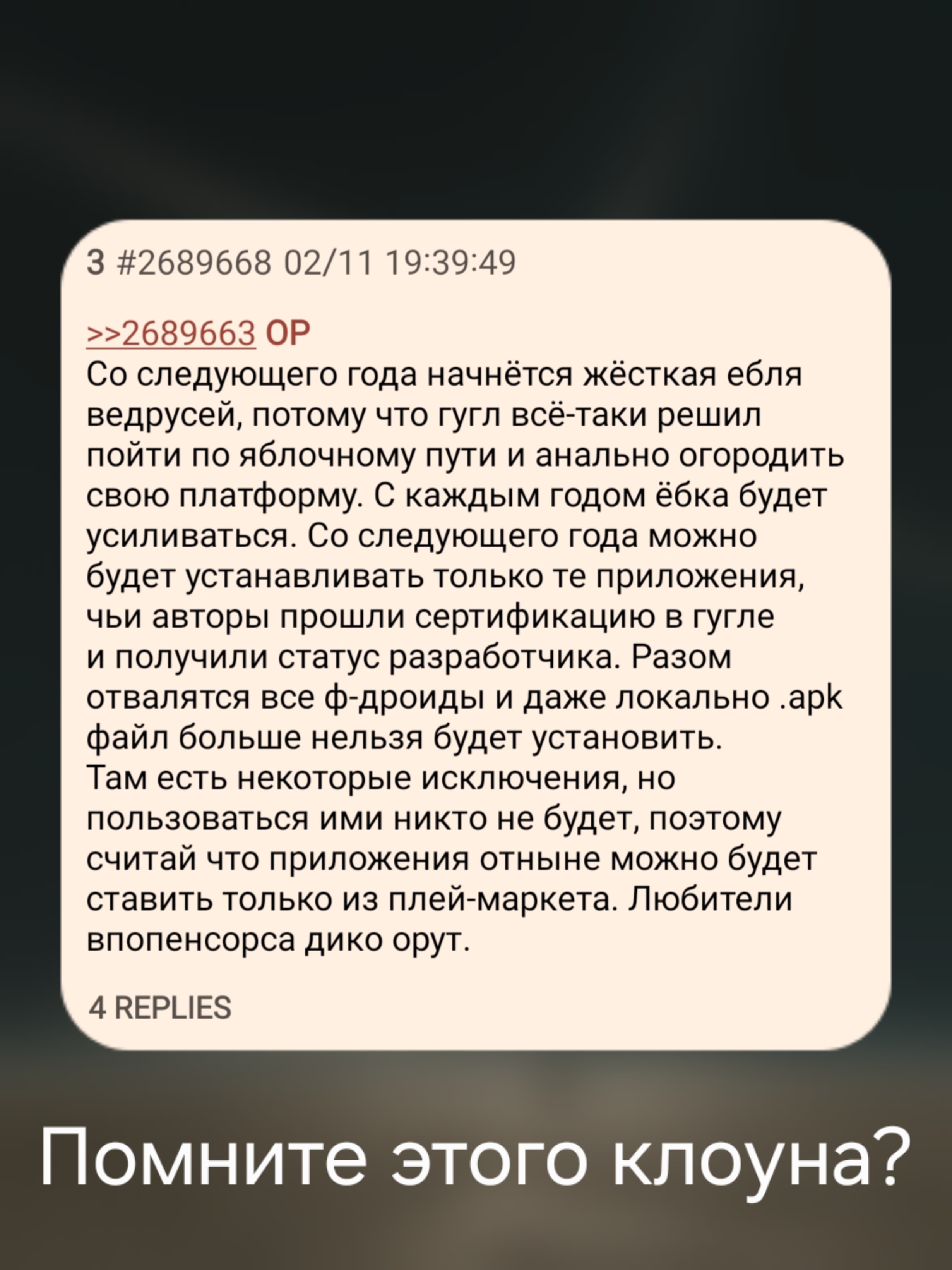 >>2691737 >Детали реализации подобной возможности ещё находятся в разработке и будут раскрыты в ближайшие месяцы Ещё нихуя толком неизвестно, как оно будет работать. >процесс установки неверифицированных приложений будет включать меры для защиты от принуждения, которые затруднят обход проверок безопасности под давлением мошенников Стоит ли говорить, что этих "мер" с каждым новым релизом ведра будет становиться всё больше. Гугл прощупал почву и теперь будет греть гоев и через 2-3 года один хуй способы установки сократятся до одного плей маркета. Это же очевидно. Иначе они бы и не начинали всю эту канитель с ограничениями. Все эти действия по обязательной верификации разрабов имеют смысл только при блокировании установки приложений из неизвестных источников. То что гугл продолжил разворачивать программу регистрации и верификации разрабов означает что ограничения будут усиливаться, иначе эта программа просто смысла никакого не имеет.