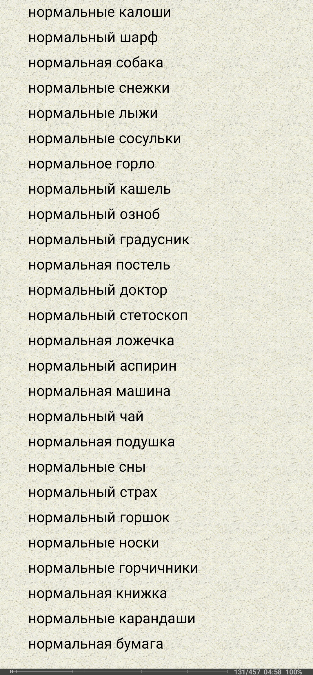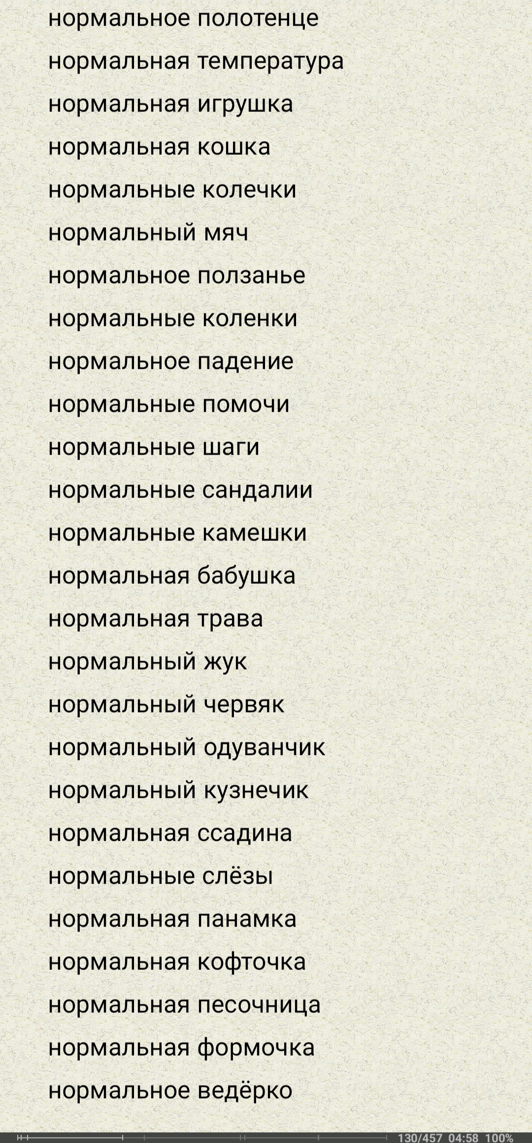 >>3740553 >>3741534 >>3741538 Если кто вдруг не читал, то поясняю. "Норма" там – это фабрично упакованная как сырок-творожок порция говна, и каждый гражданин обязан каждый день эту норму съедать. Так что когда рука тянется написать "нормальный человек, нормальные люди, а вот мы нормальные люди, а вот я нормальный человек", помните, что нормальный – это говняный. Не надо кичиться своей нормальностью, как чем-то примерным и образцовым.