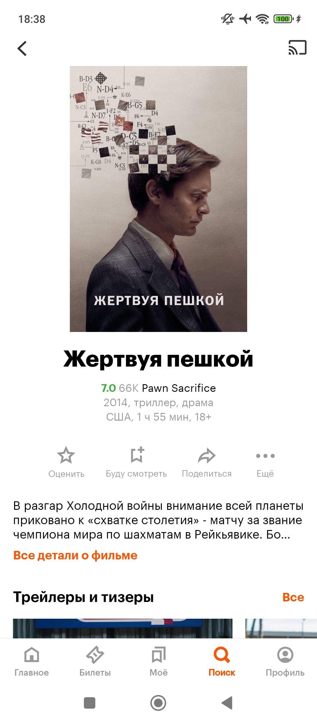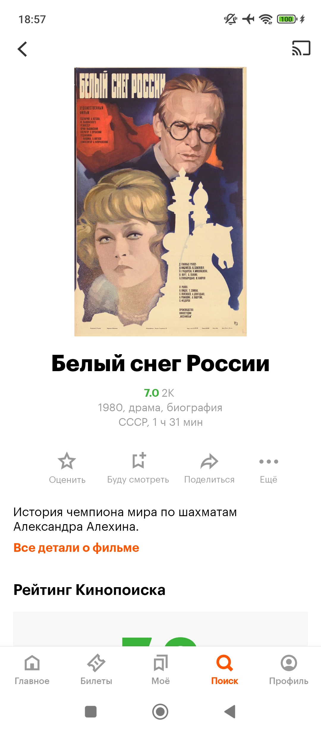 Отвратительная пошлая плоская залипуха для дрочеров на поздний Совок. Но Хабенский здесь на кураже играет лучшую свою роль выставленного гнусным подонком, мерзавцем и негодяем перебежчика Корчного. Вот так бывает, когда в плохом фильме актёр демонстрирует чудеса своего профессионализма.