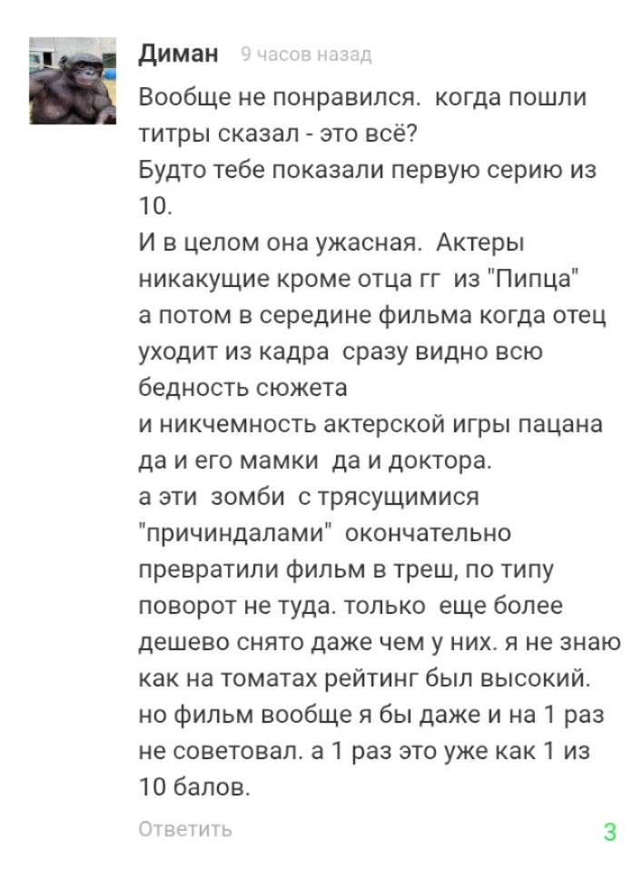 Тоже вижу всех разочарованными...так и не могу понять - фильм на самом деле говно или реально плебс отфильтрован. (но я реально не думаю что фильм будет хуже второй части...Вот там просто был ПИЗДОС НАХУЙ, как же я горел, моя срака буквально на орбиту вылетела когда доктор поцеловал жену и она разумеется его укусила и потом весь фильм дешевый зомби-раннер)