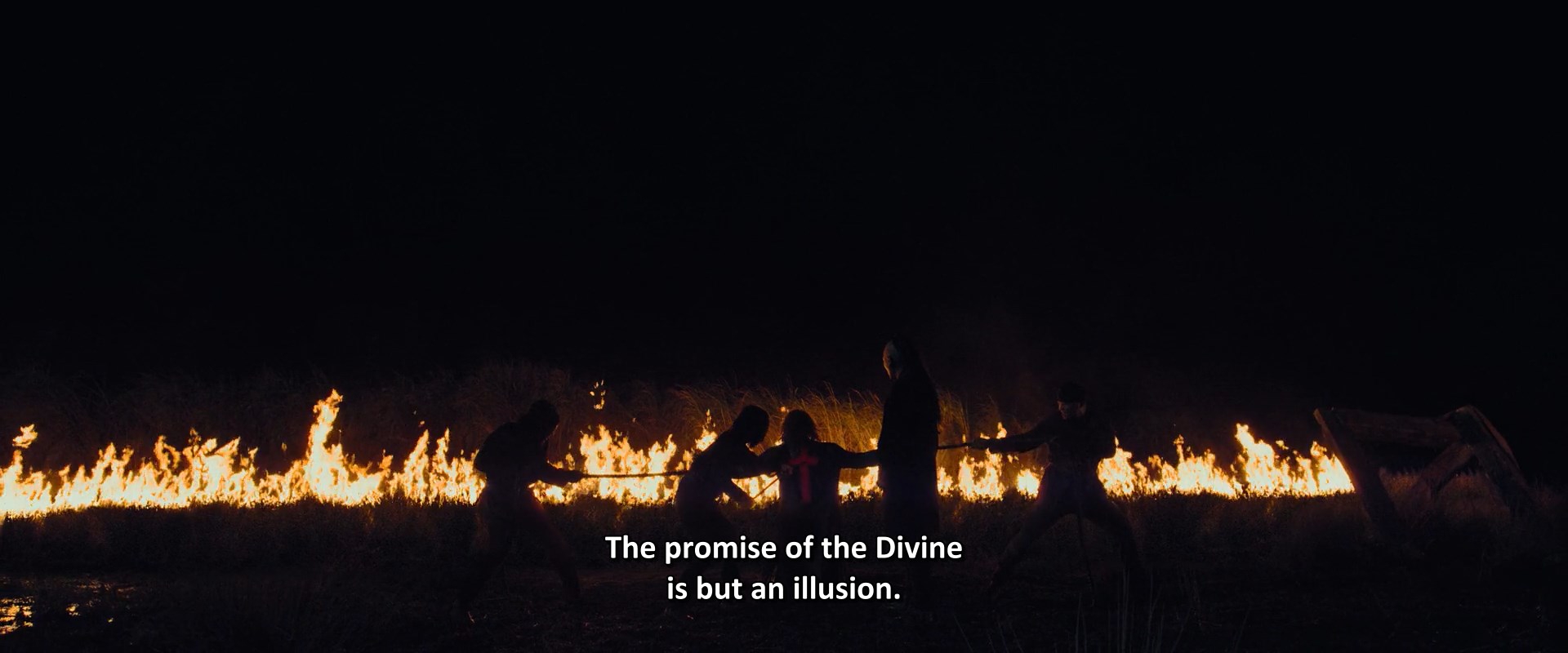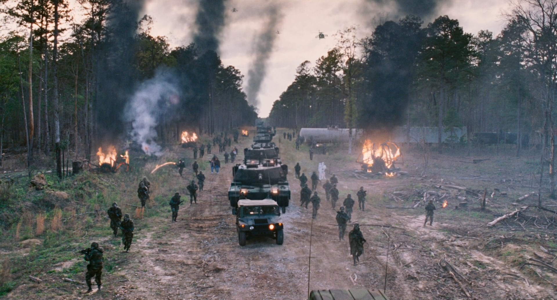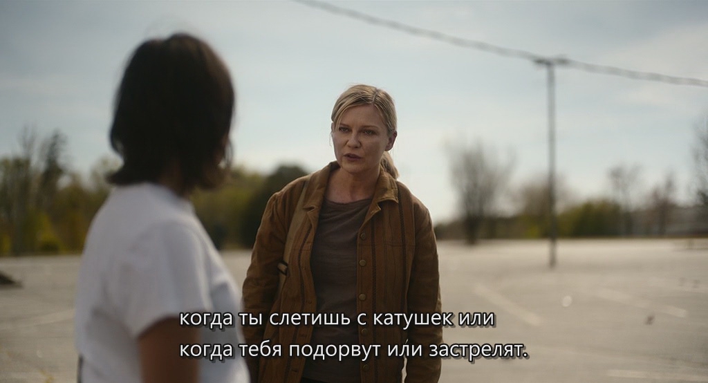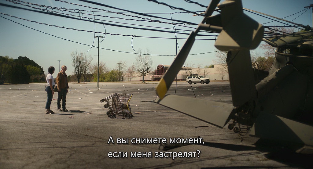 Какой рандомный, нелепый и неуместный пиздец, если учесть, что весь остальной фильм снят в духе "Дороги" — на серьёзных щах и с претензией на высокое. С тем же успехом в фильм мог прилететь Человек-паук верхом на Бэтмене под музыку из Мортал Комбат. И то смотрелось бы менее кринжово.
