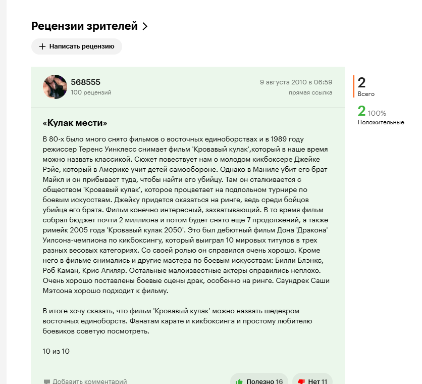 КРОВАВЫЙ КУЛАК (1989) Бля. это просто фиаско. У фильма на КП хоть и мало отзывов, но они положительные Так у фильма еще и 9 частей. и у всех в целом такая же картина по отзывам. Но что я включил и что я увидел? Начнем с того что такой треш сейчас нелегко посмотреть. Мне попался фильм с немецким дубляжом и русским закадровым переводом какого то ноунейма, который пропускал проловину фраз. ну да похуй. При этом качество картинки тупо вхс, еще и камера временами делает углы по горизонтали, я ХЗ это оператор был в говно или так вхс пленку криво в цифру перевели. Но на этом проблемы не заканчиваются. В этом фильме бои сняты сука В ТЕМНОТЕ. Натурально бойцы пиздятся на каком то затемненном ринге, где их лучи прожектора выхватывают. как аэростаты в перовую мировую. Сюжет это калька с кикбоксера, только более ебанутый. Трейнинг монтаж настолько им было насрать делать что ДОН ДРАКОН УИЛСОН просто тупо бегает и пиздит бутылки, вот и вся тренировка. Естественно тут есть секси блонди, которую он потрахивает. Бои просто какой то кал, даже в бюджетном говне сейчас лучше снимают. Реально, после таких фильмов ты понимаешь что рокки это шедевр, а сталонне - гениальный сценарист и режиссер. Тут просто какие то куски говна пиздятся, сюжет , чтобы вы понимали - брата гг убили и он едет в манилу, там его окучивает какой то дед, тренирует на похуй, типа пробеги 500 метров, еще он встречает из воздуха появившегося америкоса и его сестрУ. КОТОРУЮ ЕБЕТ. В фильме вообще большинство твистов и персонажей просто возникают из воздуха Например у гг был тренер в сша, который приехал в манилу к нему в середине фильма. Вся его роль - просто стоять в кадре. Он не тренер даже, это просто какой то левый мужик. По итогу оказывается (спойлер) что тренер дед из манилы это и есть убийца его брата, потому что его брат на ринге убил его брата. Как вам? вальнуло индией по низам? Но нахуй он его тренировал тогда? Короче это мутный кусок говна за 30 копеек, который даже в 90-х выглядел как трешатина. Я ХЗ как теперь смотреть следующие 8 частей. Пожалуй перед ними пересмотрю ип мана, там хоть качественно сделано. а потом нырну в чан с говном под названием кровавый кулак 2-8 части. нахуй, не смотрите если вы думаете что это типа кровавого спорта. Это его пародия от асайлума.