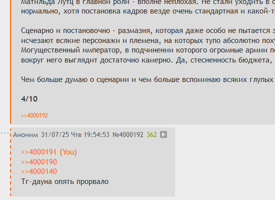 >>3999042 Как-то уничижительно о /mov/ написано, словно здесь дураки сидят. Ничем не отличаются, но это как раз хорошо характеризует /mov/. Да, здесь сидят такие же начитанные образованные люди. Только для нас анализ кино – это хобби, а для этих людей работа, на которой они пытаются зарабатывать, книжки пишут. А мы пишем в мувач. Наши тексты умирают вместе с уплывшими тредами. Грустно.