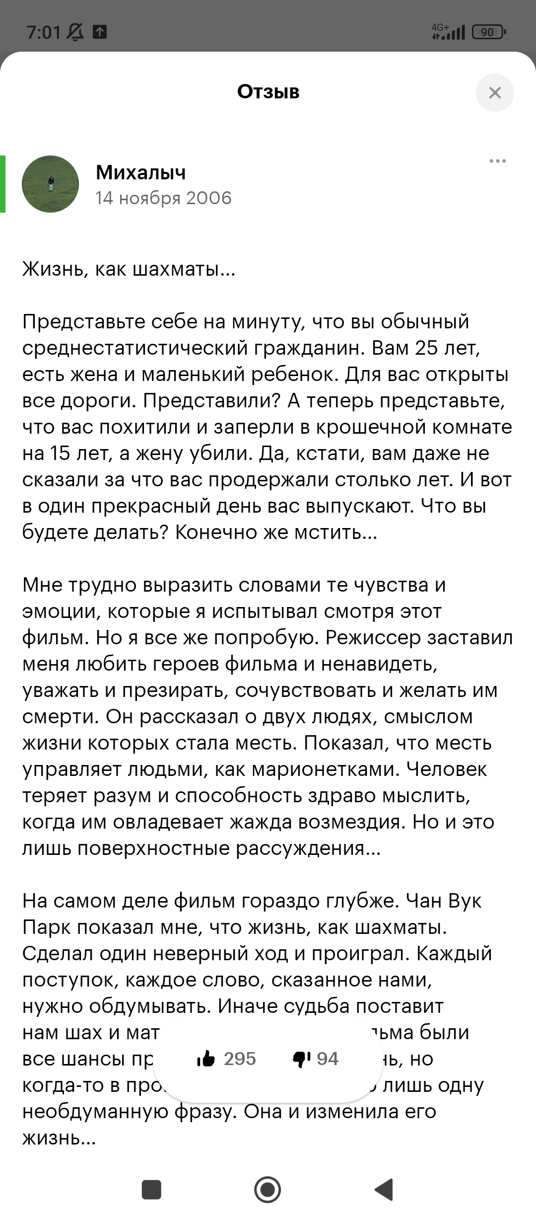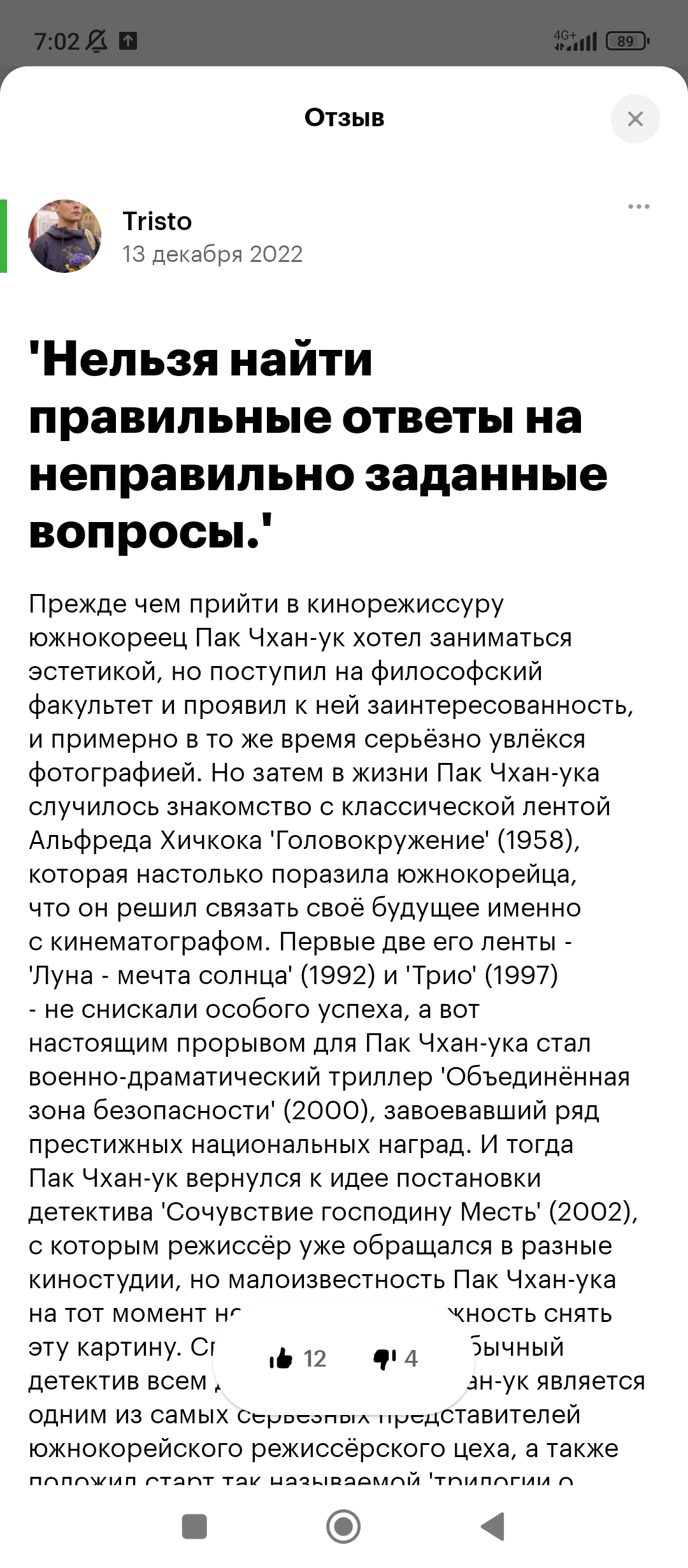 Корейцы снимают тупа топ, да и вообще азиатское кино (Китай, Япония) - заебок. Правда, я смотрел мало, но прям отдыхаешь душой после западных фильмов. По сути такие же фильмы-жвачки, но менее предсказуемые что ли. Больше всего понравился "Сочувствие господину Месть", вайб словил от фильма нереальный. Да и вообще у них вот эта суровая жестокая реальность получается отлично. Без тупых хеппи-эндов и морали прямо в ебло зрителю. Что-то вроде фильмов Зайлера, наверное (он режиссер Костяного Томагавка и Закатать в асфальт). Уверен, что тут полно сеймов. Поделитесь, какие фильмы вызвали больше всего эмоций во время просмотра