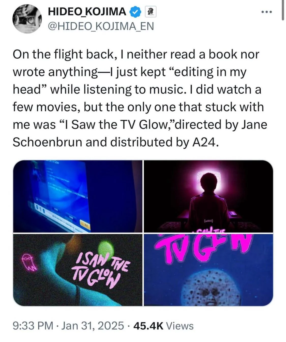 «Я посмотрел несколько фильмов, но рад, что в моей памяти остался только „Я видел свет телевизора“ Джейн Шенбрун, выпущенный A24», — написал в X создатель франшизы Metal Gear и Death Stranding.