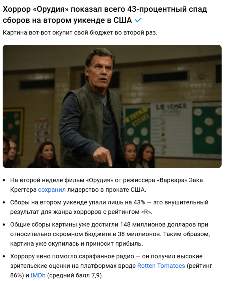 Хоррор «Орудия» показал всего 43-процентный спад сборов на втором уикенде в США Картина вот-вот окупит свой бюджет во второй раз. Общие сборы картины уже достигли 148 миллионов долларов при относительно скромном бюджете в 38 миллионов. Таким образом, картина уже окупилась и приносит прибыль.