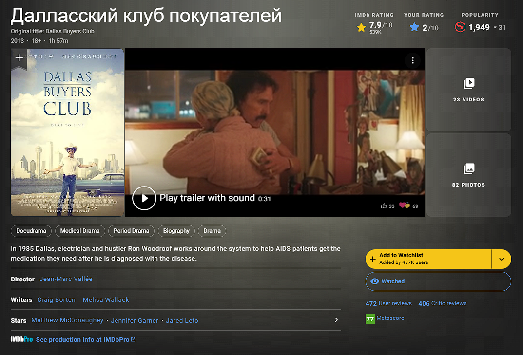 Даласский клуб покупателей начинается со сцены секса. Значит, фильм говно. Жаль, я надеялся, что у фильма высокий рейтинг не просто так - видимо, любители бреакин бэда и прочей параши наспамили десяток Но фильму, конечно, шанс дам