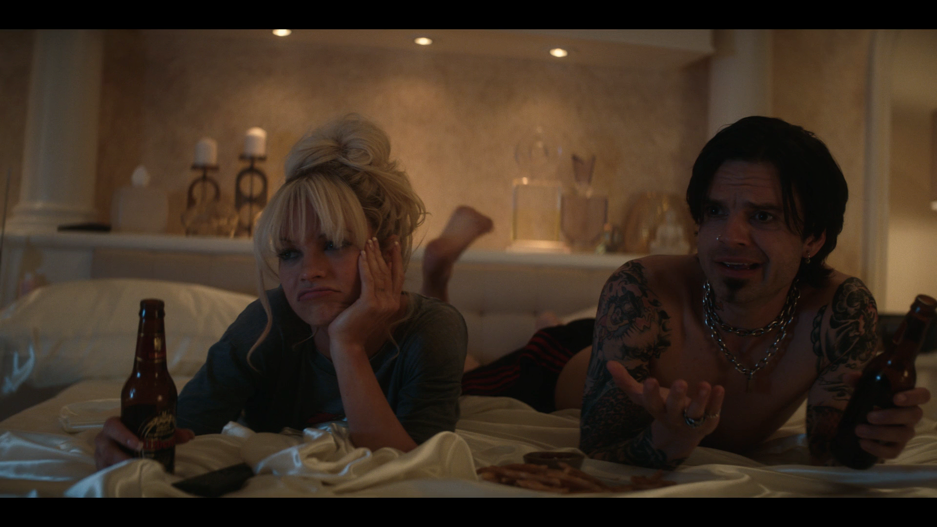 Терпеть не могу Памелу Андерсен и абсолютно равнодушен к пидрильным чмонделям Мотли Крю, но фильм про них мне понравился. Это фильм про 90-е, а не про них. Как шлюхи осознали себя феминистками, а интернет пришёл на смену старым носителям видеоконтента. И заодно о том, как педерастический гламурный соевый металл а ля Мотли Крю был прикончен в голову сиэттлским гранджем типа Нирвана или Пёрл Джем. Это как презрение к музыкальной группе "Комбинация" не мешает же с интересом смотреть фильм про них с прекрасной Базыкиной в одной из главных ролей. Лилли Джеймс в роли Памелы Андерсон не менее талантлива, чем Базыкина в роли хабалки из Комбинации.