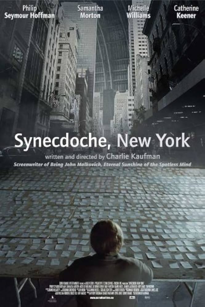Условный Хржановский 17 лет ставит свой мега-проект, в котором меняются актёры, западает и сбоит реальность, тоскливые сны заставляют рыдать об упущенных возможностях и точках, где твоя судьба свернула не туда. За рыдания тут отдувается большой специалист по плачу Филип Сеймур Хоффман, которого его персональный "Дау" крутит и так, и эдак: режиссер всего этого расползшегося как грибница театрального безобразия то покрывается нарывами, то теряет (и не единожды) дочь, то вообще препоручает свою жизнь изображающему его старику. Как в классических снах - тут можно получить свидание в горящем доме, запутаться в жёнах и подругах, избить врага на виду у посетителей кафе и творить прочую дичь, оправданную онейрической причудливой логикой. Но сны обычно волнуют только того, кому они снятся, всем прочим они до причинного места и слушать их пересказ - занятие мучительнейшее.