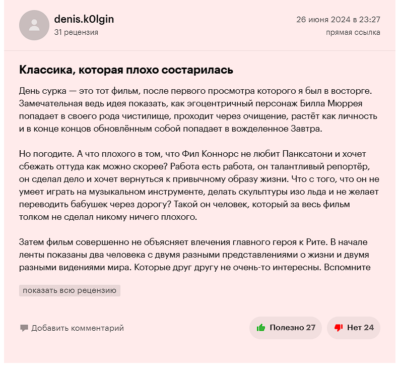 Пока что "День сурка" значительно лучше и тоньше справляется с высмеиванием нормилайфа, чем "Бойцовский клуб". В "Дне сурка" хотя бы режиссёр потрудился осветить другую сторону восприятия происходящего, в связи с чем само высмеивание имеет знак вопроса - что отличает от "Бойцовского клуба", где авторской позицией тебе плюют в рожу шкилосмехуёчками