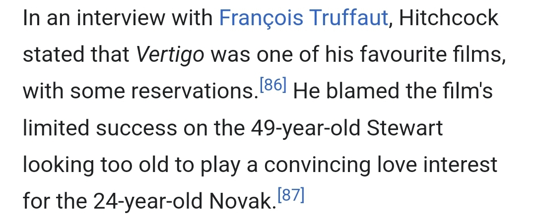 >>4035238 >>4035239 ну так и стюарт в вертиго не выглядит дедом. хичкок просто решил оправдаться за относительный провал и нашёл крайнего. пидор английский. мне вообще кажется, что зрительское восприятие известных актёров, которые давно снимаются и которых зритель помнит молодыми, отличается от восприятия теми же зрителями неизвестных им людей. известные актёры условно "вечно молодые".