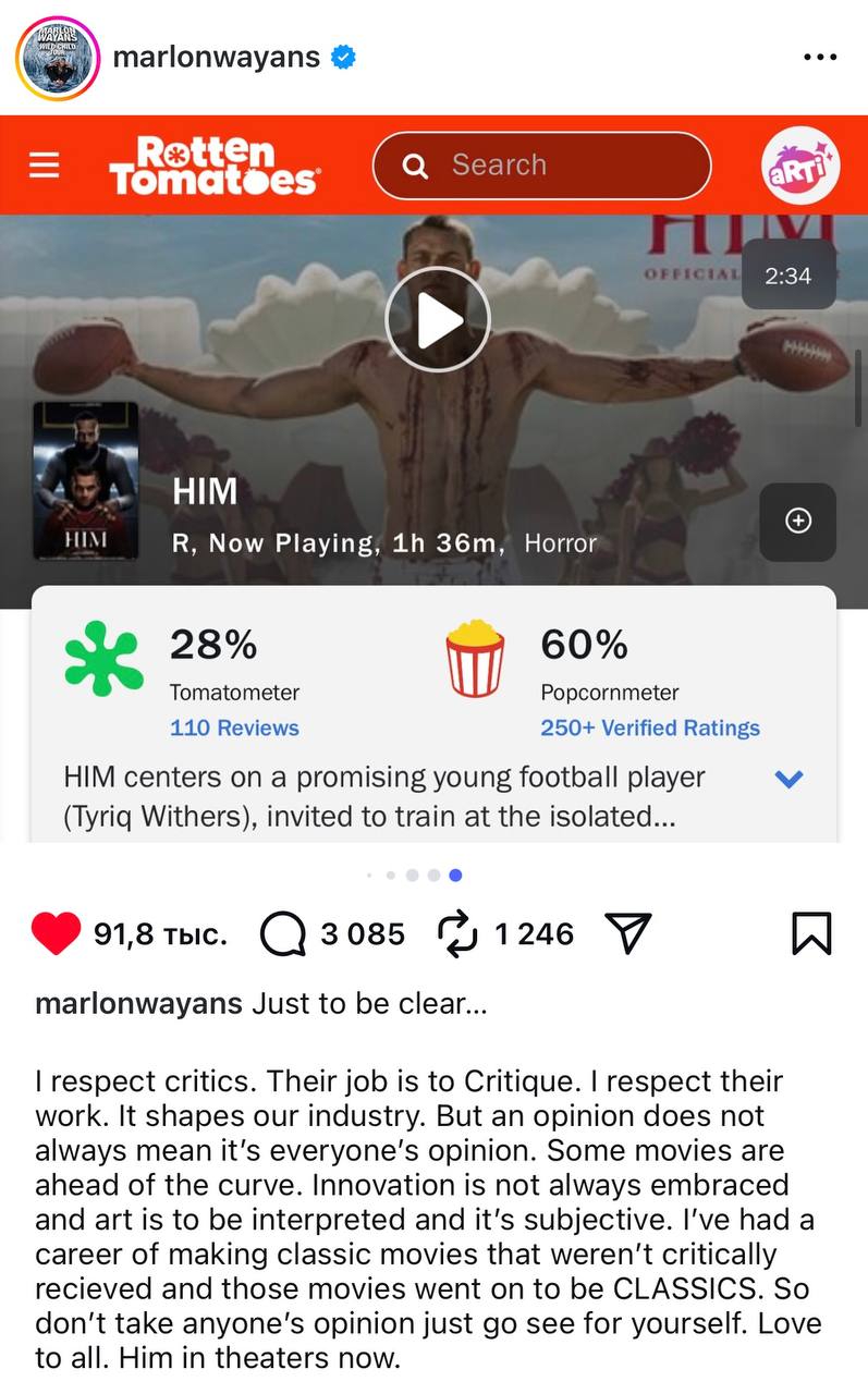 >>4035871 В душе не ебал, что Пил новый фильм выпускает, но после трейлера захотелось посмотреть. Похоже на какую-то угарную дичь, и из-за ебала Марлона Уэйанса меня постоянно на смех пробивает, хотя ничего смешного не происходит, настолько прочно он у меня ассоциируется с молодежными комедиями.
