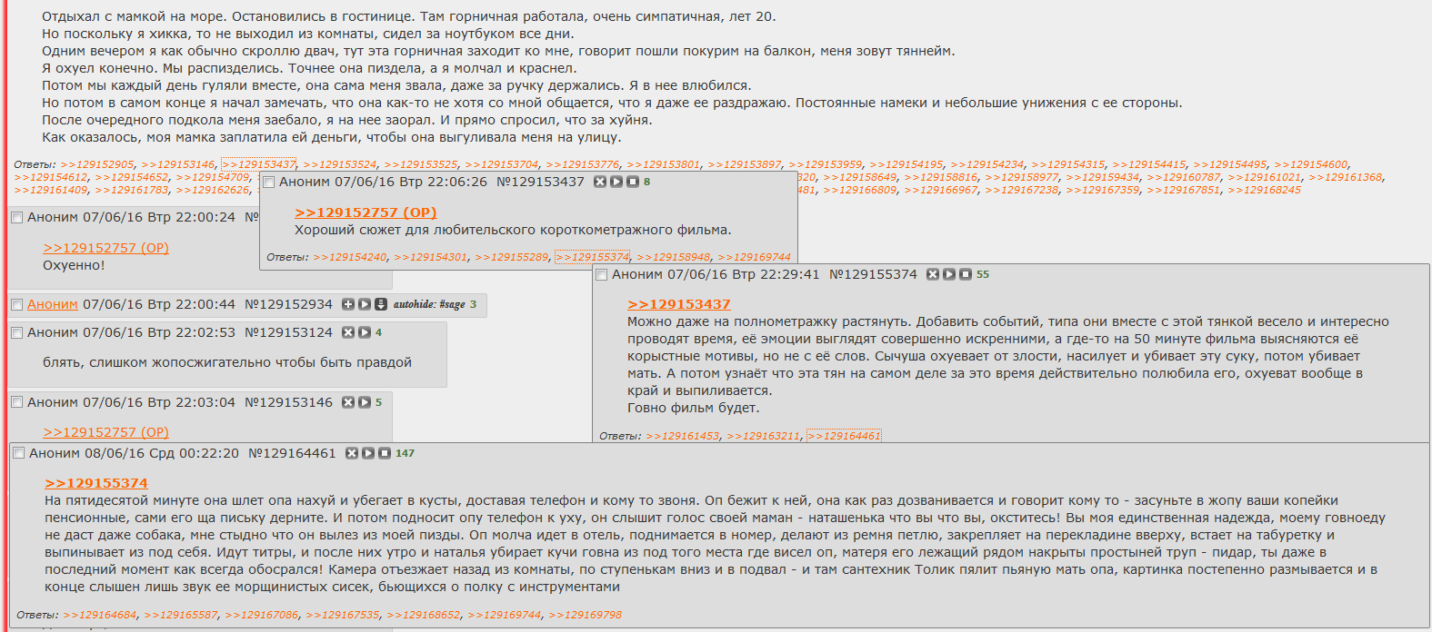 То, что твоего опыта не наберется даже на бугурт-тред это даже хуже. Ты рьяно отстаиваешь идею о съемке этого фильма, при этом не имея подобного опыта. Ты скажешь: ну проблема существует. Хорошо, опросим другого участника бугурт-треда, и окажется что и у него не было подобных ситуацией, а самой жесткой являются классические кринжовые новогодние застолья или желание родителей выглядить хорошо в глаза других (но без перегибов). Опросим третьего, четвертого, и окажется, что история про подштанники является вообще выдуманной, и является лишь фантазией обиженных двачеров, которые просто представляют, как их жизнь могла бы быть еще хуже.