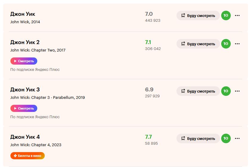 Неплохой такой боевичок вышел, даже ушла небольшая эпоха Рэмбо для зумеров, а так мой вердикт таков: 1 часть: Самая заебись, где Ривз выглядит хоть чуть-чуть реалистичным, сбалансированы драки и перестрелки, да и тут Уик хоть какая-то личность, а не просто машина для убийств, да и делал он хотя бы обдуманные поступки в отличие от последующих частей. 2 часть:Вот её плохо помню, но помню. что именно к боевиковатой части фильма никаких вопросов нет. А так Джон Уик должен был закончится на этой же части, если бы ГГ хоть иногда включал голову и не убил главгада в Континенталле. 3 часть:Самая слабая часть, унылый самоповтор, да и враги уже ходят в каких-то мегабронежелетах, и Джон Уик их убивает пачками, что перебор даже для боевика 4 часть: В принципе не плохо, но и эта часть ничем примечательным не запомнилась, хотя экшен и музыка поставлены хорошо, с эпизода где он православной церкви орал в голос. Внимание спойлер :тут Джон Уик всё таки спустя 400 убийств удосужился выключить читы и умереть. И за это создателям спасибо, так как серия уже выдохлась они решили остановить этот конвеер, разве что надеюсь не додумаются снимать 5 часть и "воскрешать" Уика . А так "зумерский Рэмбо" мне нравится меньше чем оригинал. Рэмбо хоть и боевичок под пивас, но там ГГ хоть какими-то переживаниями делился и был живым человеком, а Уик как будто любой ГГ из шутера нулевых, когда персонажи ещё не разговаривали