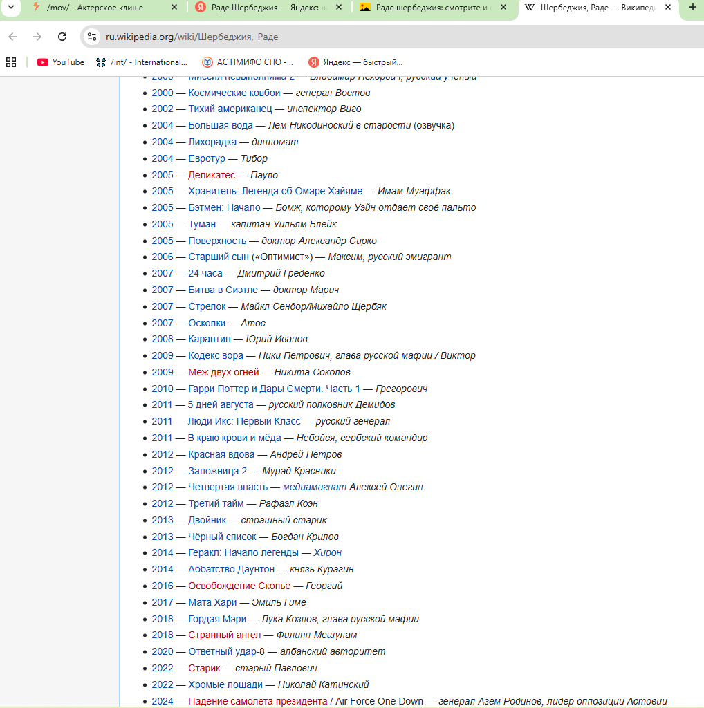 Раде Шербеджия попроисхождению Серб постоянно играет роли русских например в фильме большой куш (БОрис Бритва) ,миссия невыполнима -русский ученый,кодекс вора глава русской мафий,люди икс первый класс-русский генерал