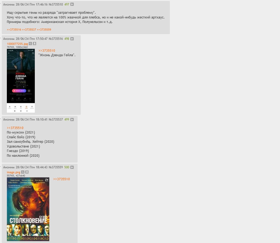 >>3763016 Продолжаю. >что ему нравилась. Ну в тотал дивиди были маленькие обзоры весьма редких фильмов на тот момент, особенно когда Кинопоиск только начинал работать и чуть позже, когда далеко не у каждого фильма была обложка и описание на сайте. ( да и сейчас не всегда). Там иногда делали своеобразный марафон по фильмам, франшизам или по актерам, режиссерам. Вот это было прикольно и интересно. Структурировало в голове информацию на отлично. А с оценками выданную звездочками я часто не соглашался. Ну есть еще Искусство кино, старейший киножурнал СССР и России, просмотрел его когда им начал заведовать Долин, плюнул с этих ебанных снобов и пошел дальше. У них даже обложки уебанские, специально так делают, наверное, чтобы люди меньше их журнал покупали. Примеры на пиках. Последний из Видио Асса. Хотя есть очень редкие статьи, которые интересно читать чисто в информационном плане, например статья на кончину Роджера Кормана, где рассказывается как он закупал фильмы в СССР. А чисто оценочные и типа аналитический разборы фильмов и творчество режиссеров, ну чистая вкусовщина и повторю оголтелый снобизм. Уровня записок о фильмах Торчковского( Смотрел Синяние кубрика- коммерческая галимотья!)