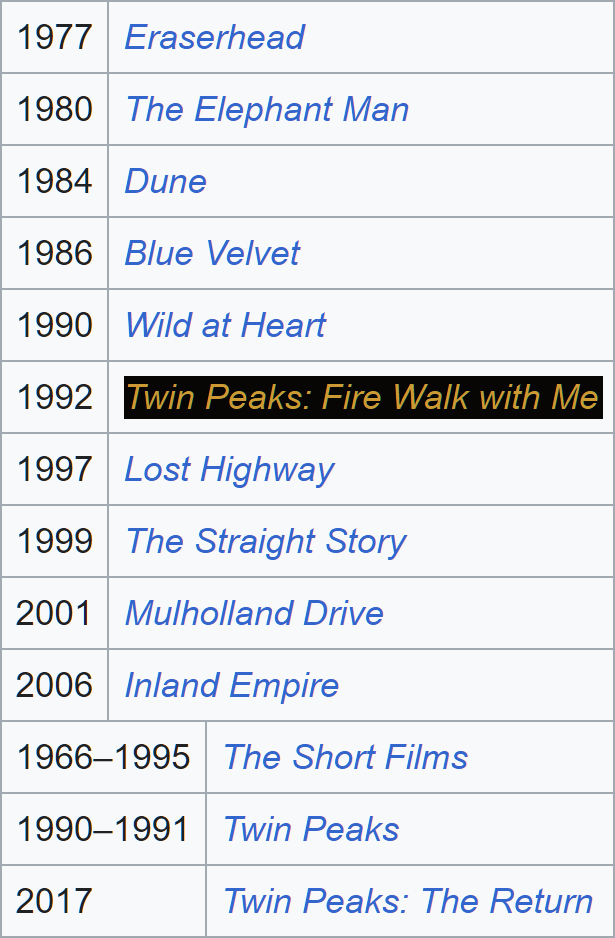 >>3986932 УПД. Забыл ещё про "Простую историю" и полнометражку "Твин Пикс огонь иди со мной". Первую оставь в список для отдельных произведений (к "дюне" и "человек слону"), а полнометражку твин пикса смотри сразу после первых двух сезонов. Это приквел, но этот тот случай, когда приквел нужно смотреть только в рамках чёткой хронологии выхода произведений этого лора (1989-1990 первые два сезона - 1992 полнометражка - 2017 третий сезон)
