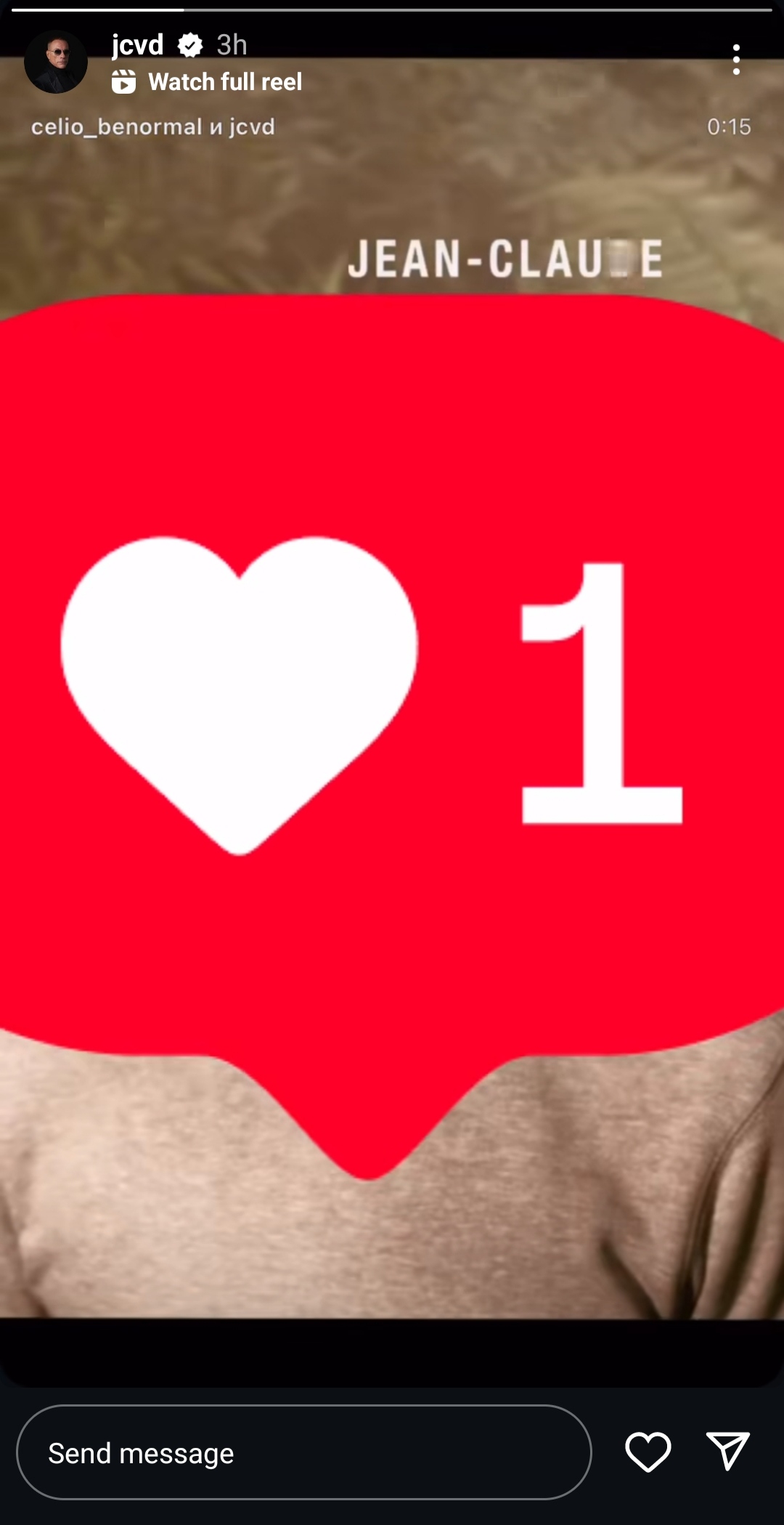 Ван Дамм показал этот ролик в своих сторис. Стандартный формат, где в сторис виден выбранный кусочек ролика, ещё наложена какая-нибудь хуйня сверху (в данном случае огромная иконка лайка), и можно перейти посмотреть сам ролик.