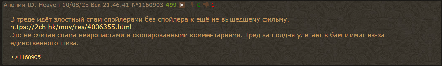 Вообще раньше за спойлеры к еще не вышедшим фильмам банили я так лично за спойлеры к лонглегс бан словил. Что изменилось сейчас, спрашивается, особенно когда спойлеры в виде полноценного вайпа?