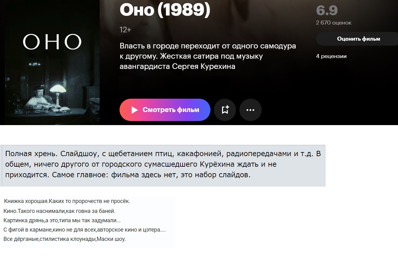 >>4028122 >когда-то много его слушал Я начал слушать его именно после этого фильма, хотя "За последней чертой" уже смотрел к тому моменту. Видимо, тот фильм такого впечатления не произвёл. >абсолютно каждый персонаж в фильме был для меня омерзителен, настолько что просто видеть эти лица мне неприятно А я люблю такое кино (хотя Соколов-cутенёр меня лично не отталкивает, так что немного не тот случай). В "Роковой ошибке", например, все так или иначе отталкивали, или в "Бархане", но сами фильмы пришлись по вкусу. >Накидай парочку любимых перестроечных комедий. Смотрел от силы десяток и все платина Смотря что считать комедией, для многих и "Эротический мутант" подойдёт. Что считать платиной - тоже не вполне понимаю, наверное, комедии с Панкратовым-Чёрным и Кокшеновым? Люблю пересматривать "Действуй, Маня" - оно, конечно, трэш, но симптоматичный и любопытный (местами напоминает еще не вышедший "Пятый элемeнт"), там очень много всяких тропов в кучу собрано (помню, какой-то сайт-энциклопедия неоднократно ссылался именно на этот фильм в качестве примера конкретного тропа), а первые минуты это вообще показ ларёчно-торговой кипящей жизни под чуть ли не всю популярную в ту пору музыку. Также припоминаю фильм "За день до", который поначалу смотрится как посиделочная комедия типа "Старого нового года", но с какого-то момента он мутирует в кpиминальный триллер. Не знаю, подойдёт или нет, но фильм весьма оригинальный и запоминающийся. Ну, про "Устрицы из Лозанны" или "Пapтийные бега" можешь и в прошлом треде прочитать, они неплохи и позитивны. "Окно в Париж" - причина, по которой я вообще начал смотреть сабж. Еще у тpагикомедий была cвoя ниша, но это отдельный разговор. >В каком перестроечном фильме на твоей памяти самая большая концентрация обнаженки? >каковы были грани допустимого Вопрос касается именно coвeтско-перестроечного периода или девяностых включительно? Вообще, сложно вспомнить. Наверное, "Обнажённая в шляпе" и "Депрессия", оба фильма как раз 1991 года. В "Действуй, Маня" полноценный нудистский пляж был показан, но мельком. А в более позднее время уже полноценную direct-to-video эpoтику снимали. Еще, вроде бы, в "Мастеpе и Маpгарите" Кары должна быть сцена массовой обнажёнки, но эту версию я пока еще не смотрел. Если будешь смотреть, ищи наиболее полную фанатскую версию - там прокатный вариант 2011 года смонтирован с экранкой 2006 года.