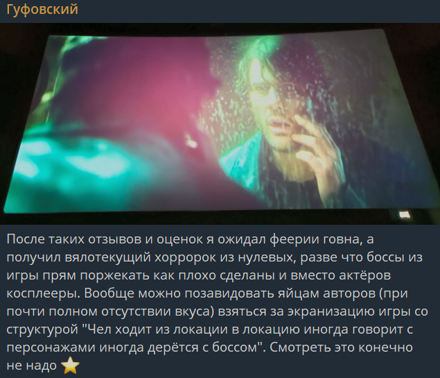 Короче мне больше всего это говно напомнило реально какой-то парк развлечений, где типа воссоздали локации из фильмов, поставили статистов в костюмах монстров, и ты тип идёшь сквозь всё это, и такой о, помню это из игры. Статисты чот пытаются, руки вскидывают, тип "ааа, страшно тебе?", и всё. Только ирл бы это ещё как-то смотрелось, тип в локациях постоять реально, сфоткаться. А в кино вообще никак, нет нормальной картины, просто обрывки какие-то и всё.