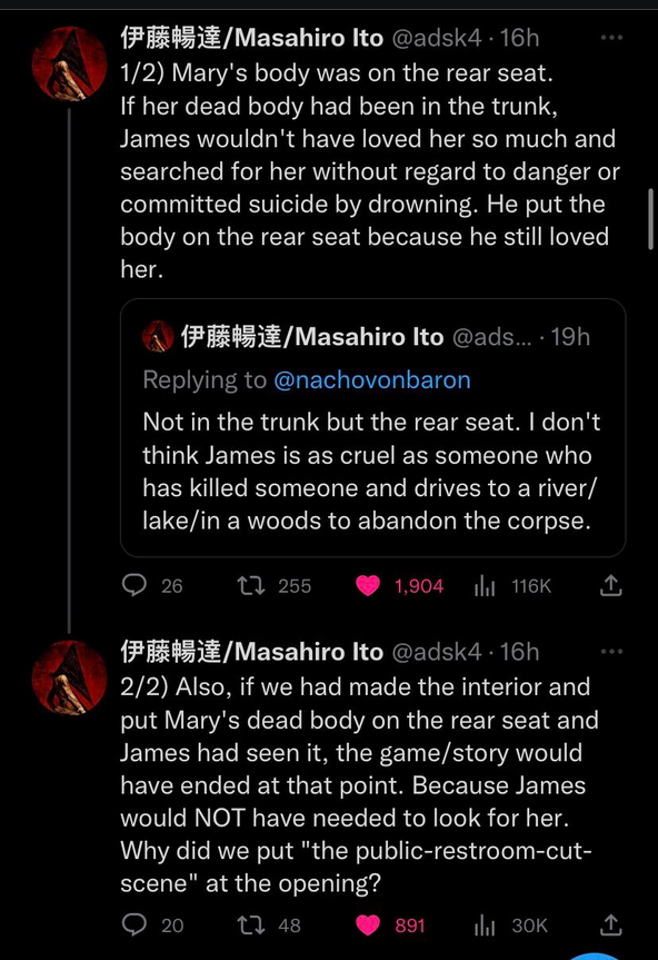 >>4114166 Так он ехал в Сайлент Хилл в труом этим на заднем сидении чтобы избавиться от него, чтобы скатить машину с трупом в озеро Толука. Но по пути его накрыла вина, и желание быть наказанным, и он подумал о том чтоб всё равно сделать это но самому из машины не вылезать при этом тоже. И в этот момент мозг включил режим самосохранения, начал искать причины жить, и вот придумал - вытеснил воспоминания о том что он сделал, и придумал что типа вот есть какое-то письмо от его жены, пойду в Сайлент Хилл её искать. При этом он сам помнит это всё, но отказывается принимать. В сортир он в начале заходит чтобы руки помыть, и тем самым как бы "смывает кровь" со своих рук (не настоящую, а образную), тем самым как бы отталкивая от себя вину. И затем в зеркало смотрит на себя как будто в первый раз, не узнаёт себя, потому что это как бы не он, он себя заново выдумал, он любящий муж, который получил внезапно письмо от жены (на самом деле пустой лист достал из кармана), и поехал тут же за ней. На самом деле сюжет очень хороший, и даже в отрыве от сайлент хилла, про уход от ответственности, и даже прокрастинацию в каком-то плане (вместо того чтобы принять реальность и сделать что-то с ней, Джеймс уходит в город пиздиться с монстрами, спасать тянку-блондинку, ну и так далее, уходит в ненастоящий мирок где пытается быть героем, но ему всё время что-то напоминает о реальности, и пытается его туда вернуть).