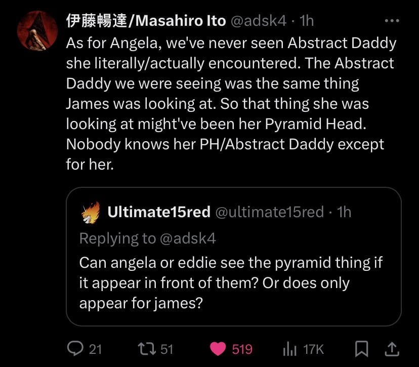 >Я планирую адаптировать ещё одну главу, потому что в серии есть моменты, которые сильно отличаются от первого фильма и «Возвращения в Сайлент Хилл». Мне нравится этот мир, и я вижу, что многие считают мою работу достойной. Безумный ублюдок угрожает превратить в говно своими мерзкими ручонками ещё одну часть, лол.