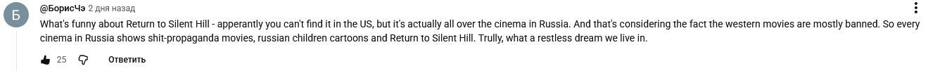 То, как выглядит этот фильм, называется стилистика. Реальная трэшовая безвкусица видна в ревелейшн - вон где все дёшево и уродливо. А француз Ганс - визионер. У первого фильма был свой стиль, у этого - свой, отдельный. Потому что режиссёр, как фанат серии, понимает, что Сайлент Хилл - персонализированный. И то как Джеймс видит город не равно тому как город видела гг из первой части. Да, графон более игровой какой-то, странный, и дело тут именно в перспективе Джеймса. Но нормисам это слишком тяжело понять, они насмотрелись видео эссе от всяких протыков на ютубе и теперь бегают со своим "правильным" мнением про то какой сх должен быть. Угу, ПЕРСОНАЛЬНЫЙ ад должен быть обязательно КАКИМ-ТО, а не разным. Заебись. Особенно смешно слышать нытьё фанатов, которые оправдывают всеми силами ориг озвучку игры, типо это так задумано, атмосфера сна, Линч, вся хуйня. Но фильм они готовы засрать, не понимая что реагируют на те же самые вещи. Только в этот раз им говорящая голова с ютуба не сказала как тут все глубоко и умно. Ну и нытьё про то что чё-то вырезали - тоже тупость. Французу видимо надо было просто лонгплей в кинотеатры пустить, а в углу свое ебало с разговорами о том как на самом деле туь все тонко. Короче похуй на быдло, выйдет в цифре - сами увидите...