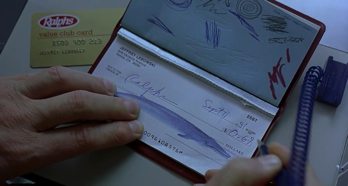 По ходу выяснил, что комический эффект в сцене, где Лебовски выписывает чек на молоко не столько в размере суммы, сколько в том, что он выписывает отложенный на месяц чек, потому что с деньгами совсем туго. Типа выступление Буша Старшего, которое он видит по телеку, было в начале августа, а чек он выписывает на сентябрь. Алсо, выписывает конкретно на 9/11.