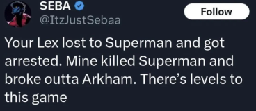 >>4049208 Гигачадовский Ганновский Лекс: 1. Создал клона Супермена 2. Имеет карманную вселенную 3. Ходит и захватывает что хочет и где 4. Имеет робовайфу на любой вкус 5. Спокоен и рассчетлив