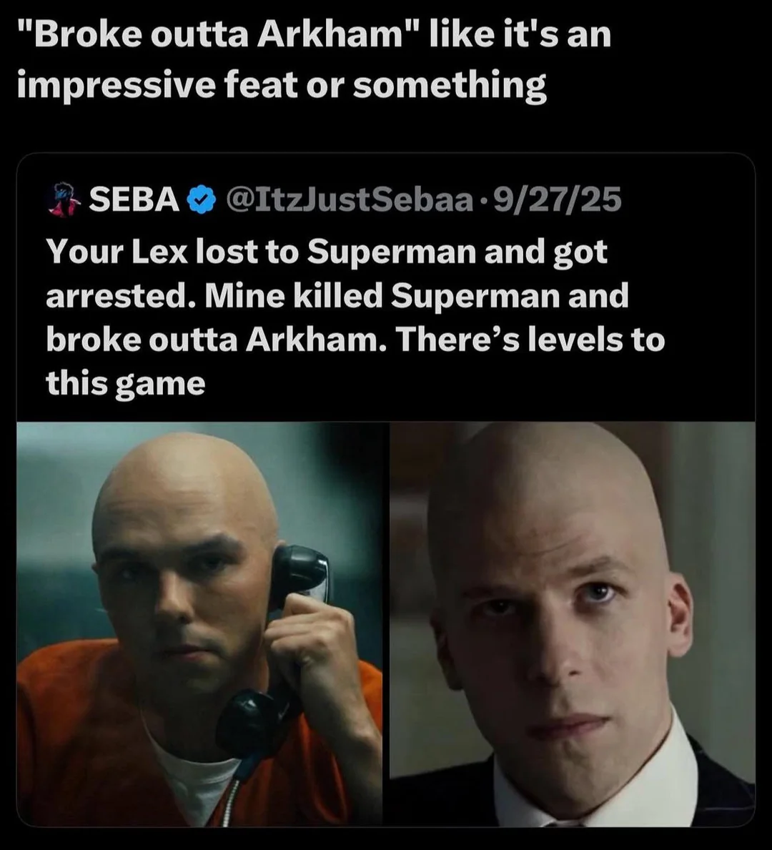 Лекс у Ганна: 1. Пыжится, тужится, пытается что-то доказать важным чинушам, но им похуй 2. Симпит по бревну, пока ему рога наставляет всратый карлик 3. Из сценарной кишки на него уронили криптонит, ручного клона памперсмена, армию суперсолдат, кайдзю, собственное подпространство - все равно проебывается 4. Когда что-то идет не так - впадает в истерику и крушит все кругом, ибо запасного плана нет 5. Хочет убить памперса - не убивает, когда есть возможность просто его застрелить 6. КТО ТВОИ РОДИТЕЛИ КТО ТЕБЯ ВОСПИТАЛ?? 7. Глобально проебывается из-за... шлюхи и собаки в плаще