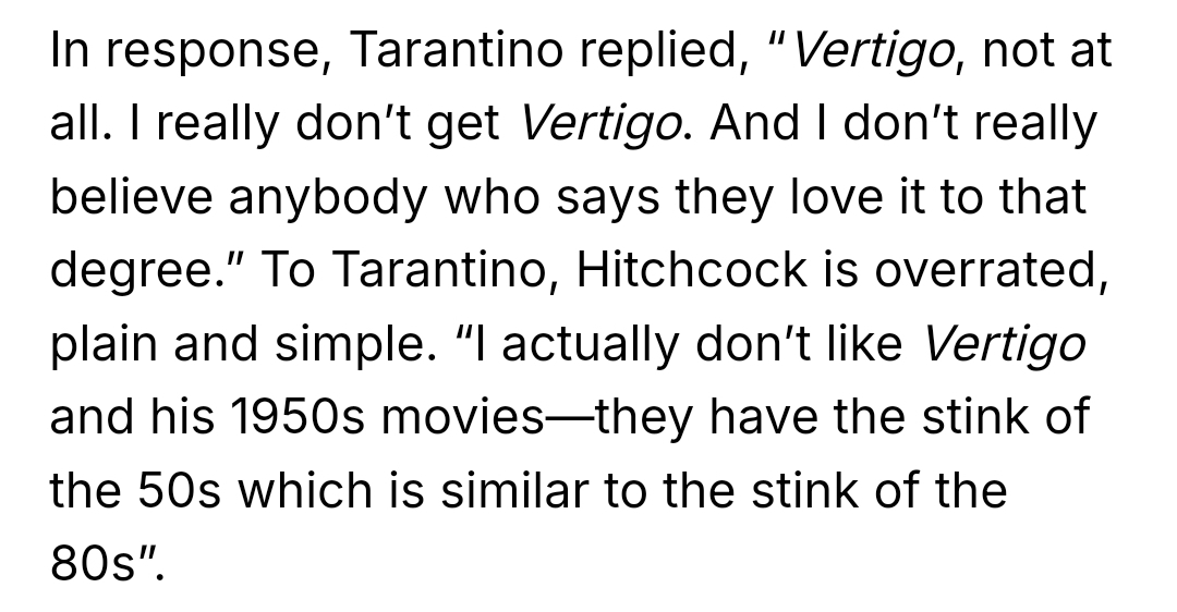 Вообще удивительно, как Вертиго по сути такая дилетантская работа с игрой и постановкой уровня деревенского драм кружка, оказывается во всевозможных топах. Причем Психо снятый рядом уже совсем другое кино, так, что это не вопрос чисто профессионализма Хичкока. И даже не вопрос списков, потому, что допустим Похитители Велосипедов мощное и достойное кино, которое даже сейчас выглядит очень крепко. Детские впечатления критиков на первые попытки в оммаж на криминальные романы типа Собаки Баскервилей? Загадка...