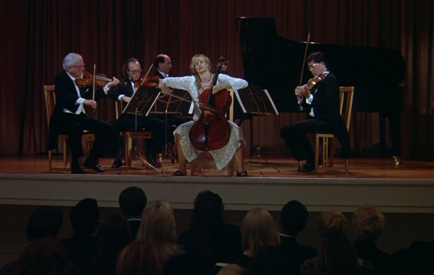 1. Бодро теребит струны. Ну хоть срам прикрывает виолончелью. Посмотрел бы, как она своей косичкой теребит клитор - но режик не настолько одурел, а жаль
