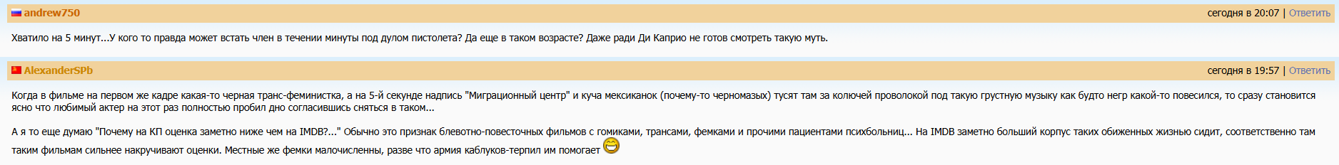 >>4066066 >Ваши ожидания - это ваши проблемы. В смысле? Фильм как бы с этого начинается и как бы ебака и производит развязку. Просто сделано это на отъебись. >Тот разговор, про который ты говоришь, состоялся уже на хуй знает каком часу Проблема в том, что он нелепый. Они его проговаривают будто сами медики с двадцатилетним стажем, а не обычнолюди. >Только потом? Не с самой завязки? Завязка вообще ебанутая и хз к чему. Можно было спокойно вырезать без потери смысла. А так лица маньяка и мужа-тирана выглядят одинаково в одежде. Даже путаницу вызывает, кто же в морозе застрял. >Не, это пет проджект чела, который и режиссер, и сценарист, и монтажер, и колорист. Дебют в полном метре, но чел много лет в индустрии и вынашивал это давно. Стоило за помощью обратиться, сценарий - сумбур. Есть такой же фильм про чела, наблюдавшего за лесом, который тоже фокус сместил с одного сюжета на другой, а потом на третий, просто потому что. >Хорошая, крепкая индюшка. На 7/10 очень даже тянет. Лажа, 4/10. >твой фильм тоже вполне может быть хорош Он поучительный, в первую очередь.