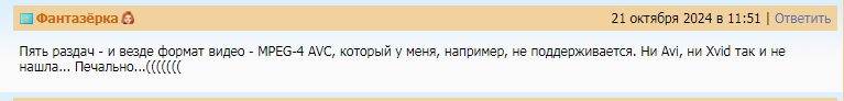 >>4071737 >720x404 А, ну разумеется. Это ж типичный размер рипа для железных DVD-плееров. Которые действительно обычно не умеют воспроизводить AVC. С одной стороны, претензия понятна, хули вы рип под такой размер делаете в AVC. С другой стороны, шёл 2024 год...