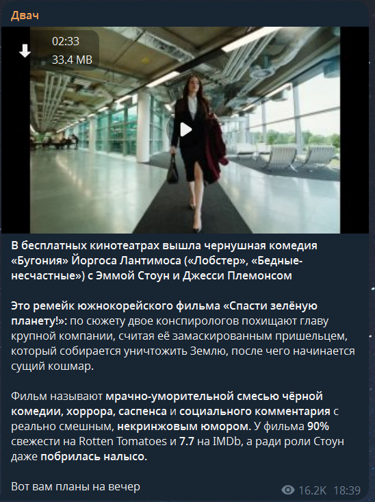 > фильм не то чтобы особо хорош "Бугония" — это в первую очередь качественный ремейк: красивый (грек там на какую-то особенную камеру снимал), местами интересный (особенно, если с оригиналом не знаком), но слишком уж заскриптованный в сценах насилия. Мне показалось, что именно в эти моменты фильму не хватает хаотичности — чтобы не было ощущения, что всё строго по бумажке, потому что так было в оригинале. И эти "качели сопротивления" у пучеглазой Эммочки: то она вся такая пассивная, "никуда не убегу, только помоюсь", то вдруг в атаку устремляется как бешеная. А-а-а! Как я мог забыть?! Она же женщина инопланетянка! Не весь фильм такой, конечно, но местами возникает зрительское очучение некоторого дисбаланса мироздания.
