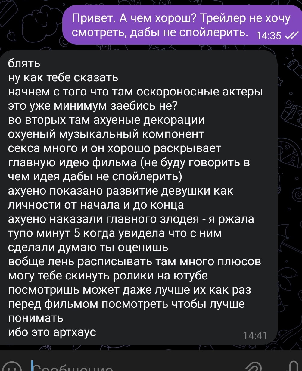 >>4073324 (OP) Бля.. Посмотрел Матрица.. знаю про этот фильм давно, слышал что Павел Дуров его дохуя раз смотрел типа? Нахуя? Хз. Но тут рил сложный сюжет с первого раза трудно понять, ну типа в матрице мы живем а не в реальном мире, ну как в быдлятне типа.. Но очень круто снято для старого фильма и постановка драк неожиданная какая-то даже. Но тут прямо нельзя фильм анализировать, я хуй знает если честно.. все тут инасказательно.. просто для образования смотрел.