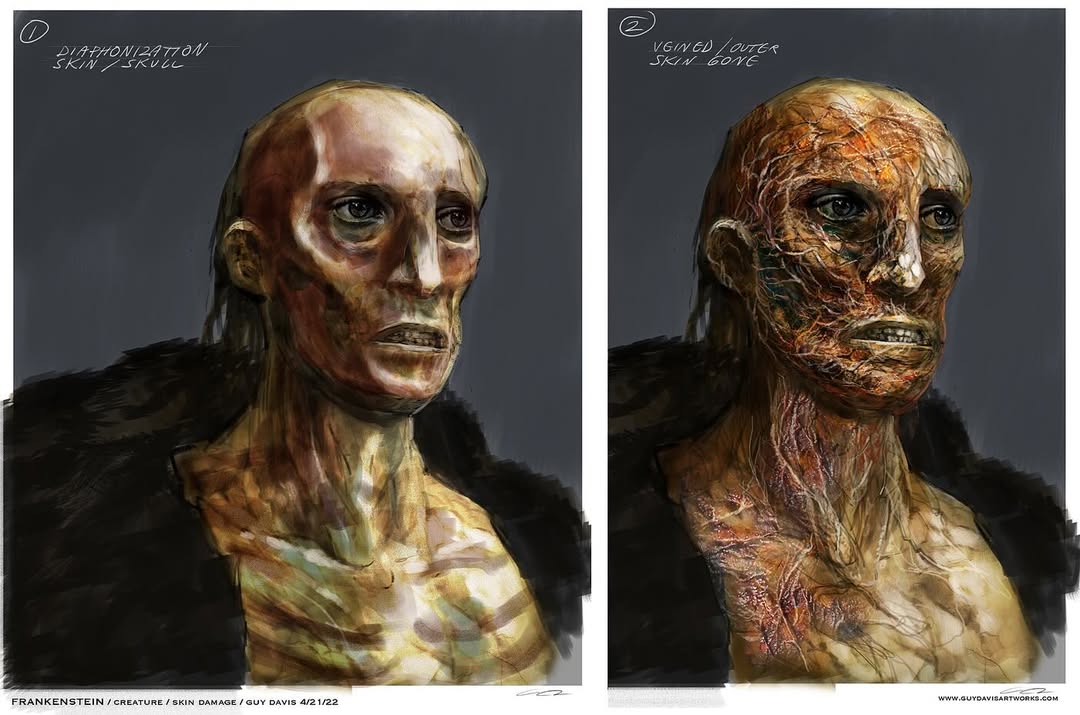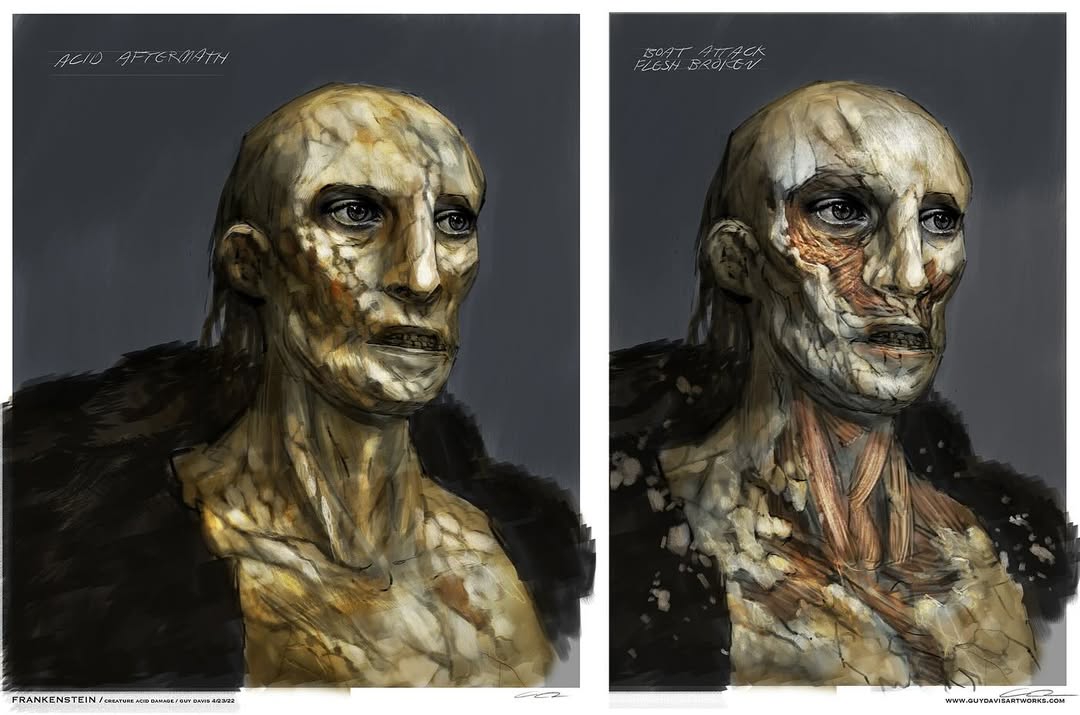 > не раз говорили, что сразу решили отойти от попкультурного образа зеленого чела со швами и болтами, потому что одна из тем фильма это отношения творца(артиста) и творения/произведения. Поэтому по задумке он выглядит как разбитая и склеенная статуя/картина Ничего из этого с итогового фильма не считывается вообще. Человек в гидрокостюме абсолютно не похож на разбитую статую. Он довольно таки целый, он развивается по ходу сюжета, становится лучше, это всё аспекты полностью противоположные разбитой статуе. А Виктор весь фильм орет на свое творение и пытается уничтожить, охуеть отношения. Хуже базиса по раскрытию темы "отношения произведения и его творца" чем Франкенштейн и представить себе невозможно. Франкенштейн это женский романчик про женскую зависть к пенису. Мери Шелли хотела себе пенис что бы им выебать труп(ну либо насадиться своей вагиной на оживший трупный пенис). Труп это единственное что женщина не может выебать никак (можно другую женщину, можно мужчину, собаку небо, даже Аллаха, но не труп — у трупа не стои́т). Поэтому Монстр у Мери Шелли в итоге просит себе невесту что бы ебать ее труп своим трупным пенисом. Писательница реализовала все свои желания внутри своего романа. Это надо было тогда Собачье Сердце снимать, а не Франкенштейна.