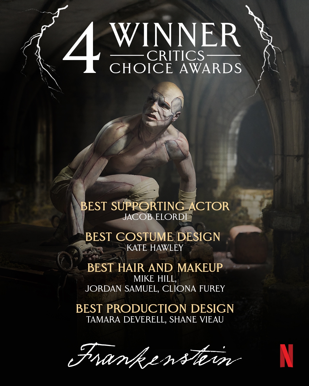 Academy nominating FRANKENSTEIN for 9 Oscars · BEST PICTURE · BEST SUPPORTING ACTOR - JACOB ELORDI · BEST ADAPTED SCREENPLAY · BEST CINEMATOGRAPHY · BEST SCORE · BEST COSTUME DESIGN · BEST MAKEUP AND HAIRSTYLING · BEST PRODUCTION DESIGN · BEST SOUND