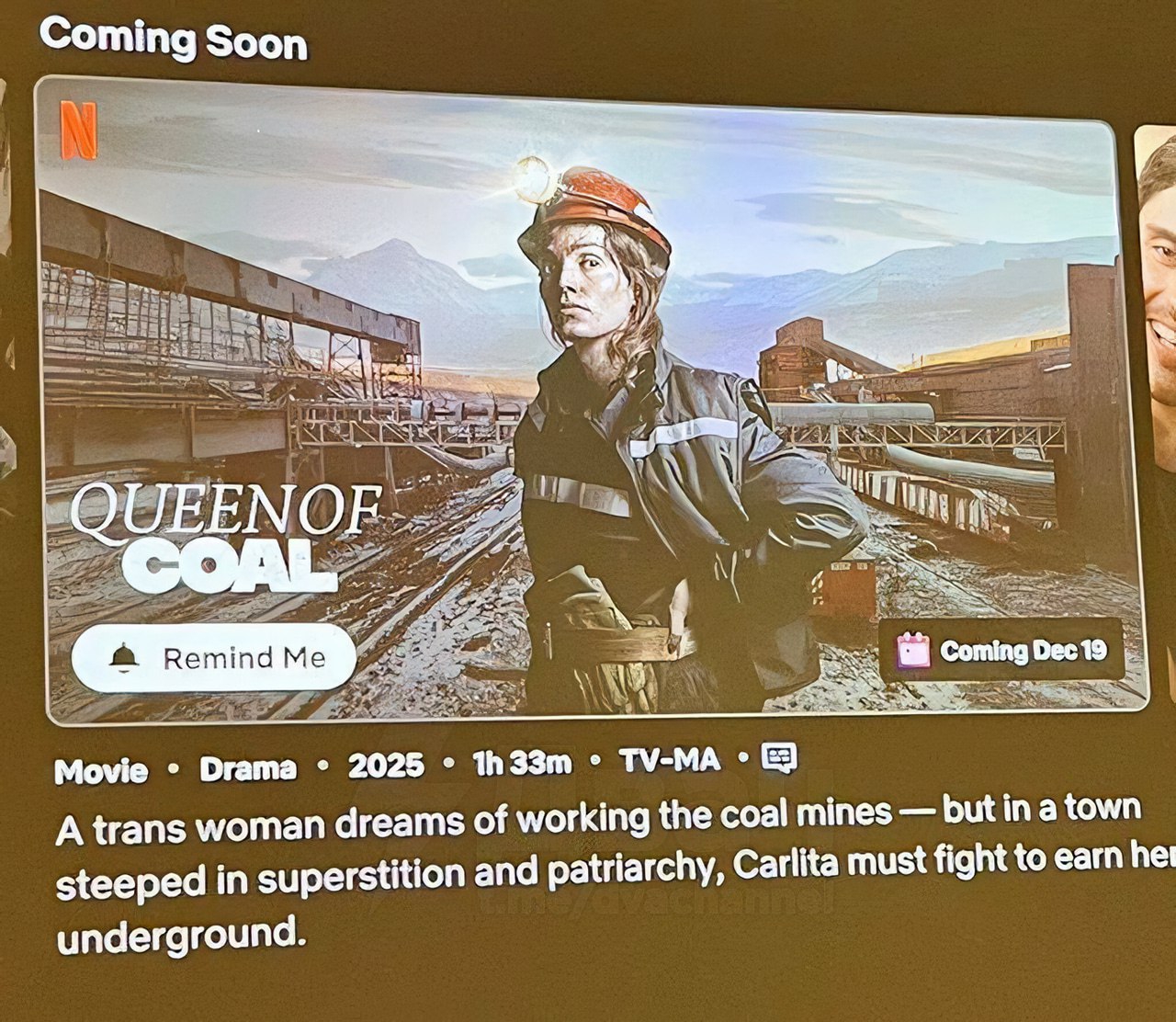 Скоро на стриминге выйдет фильм Queen of Coal — в центре сюжета транс-женщина, которая мечтает работать на угольных шахтах. Однако в аргентинском городке, наполненном предрассудками и патриархатом, ей придётся бороться за своё место под землёй.
