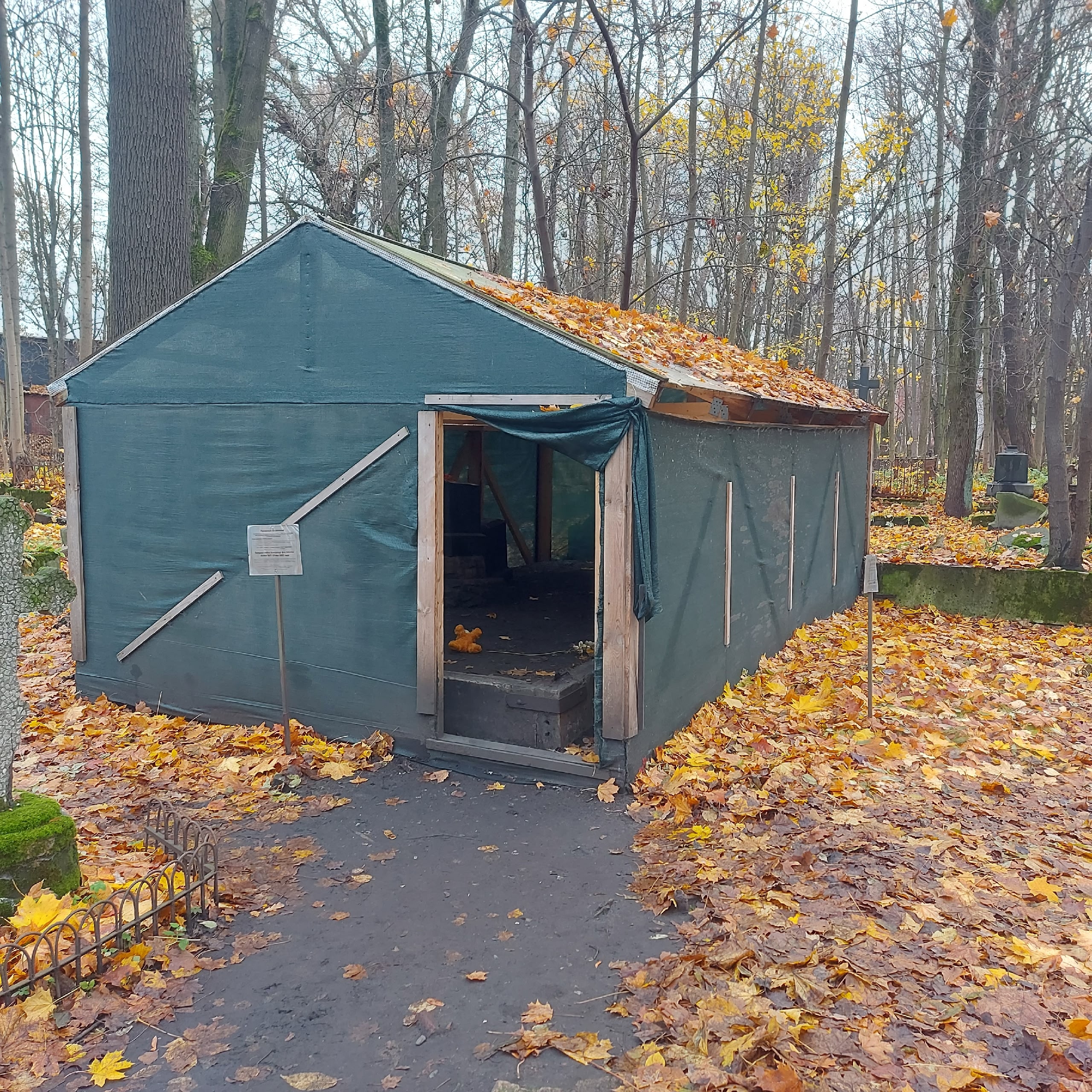 Меня ещё момент один беспокоит. Был на этом кладбище, где немец тусил. Только теплицу эту снесли, сейчас там просто навес. Так вот, он там места мало, а посреди три надгробия. Выходит, они в чей-то склеп кучу актёров затащили и снимали прям на могилах?