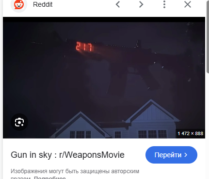 что это означает ? Сюрреалистическая фигня Вам не кажется, что ктото увидел это ружье над домом висящее именно во сне, и только вокруг этой мизерной картинке и притянут весь фильм? Типа, автору показалось это пиздец как круто - в ночи, в тишине, ты видишь огромное автомат и это пиздец как круто сбацаю как фильм под это дело